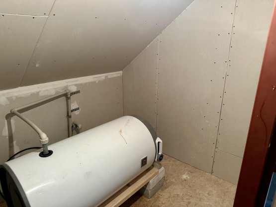 Dům je napojen na obecní vodovod, odpad je zatím napojen do septiku, ale už je připravený a dotčenými orgány odsouhlasený projekt na přípojku pro kanalizaci. Vytápění je přes plynový kotel, ohřev vody je bojlerem.