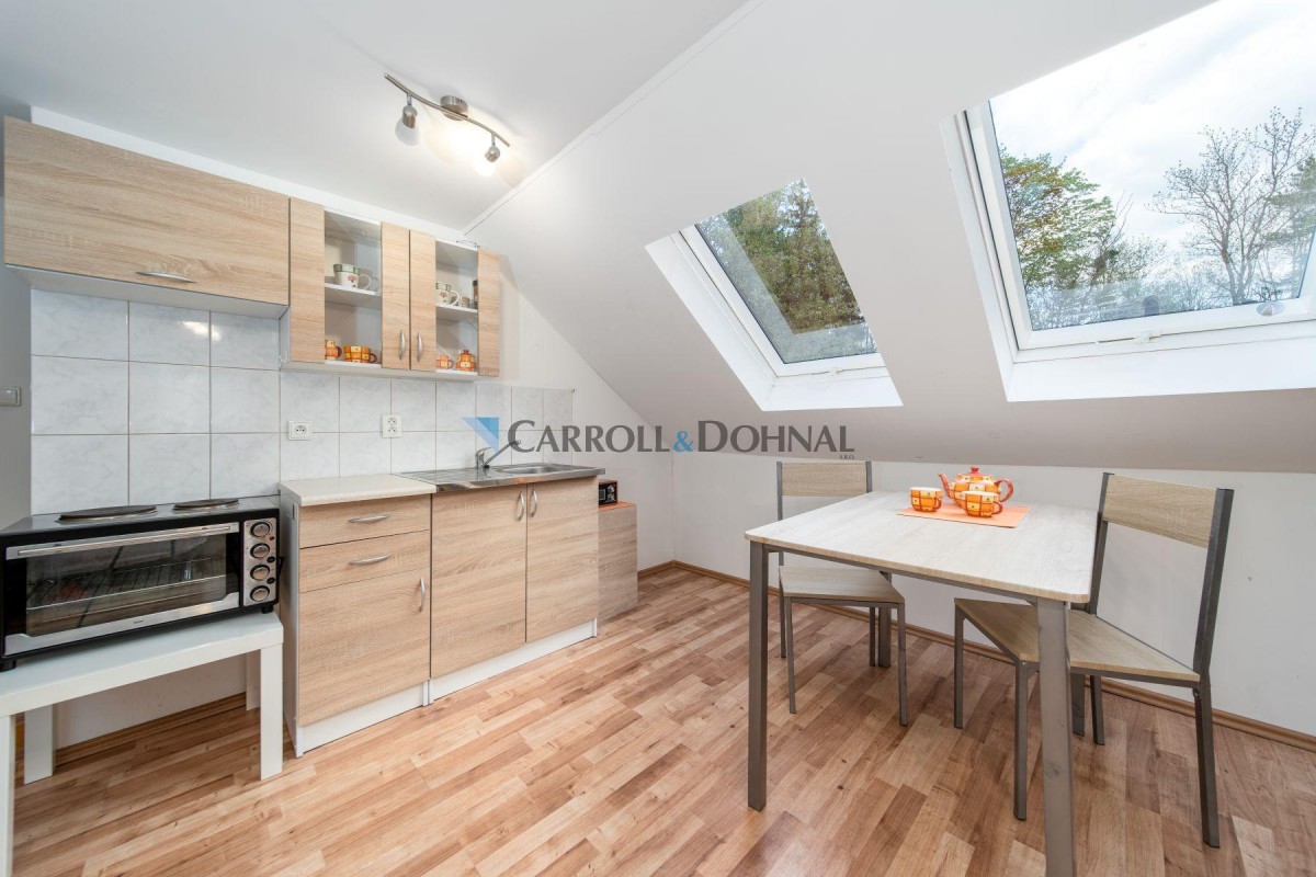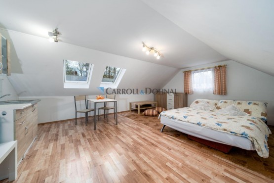 K domu patří samostatně stojící garáž pro 2 automobily s obytným podkrovím o rozloze 35. 6m2. V podkroví je samostatný pokoj s kuchyňským koutem a koupelna se sprchou a toaletou.