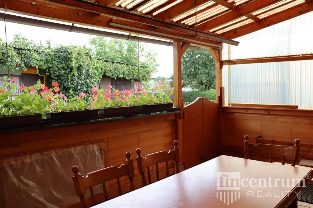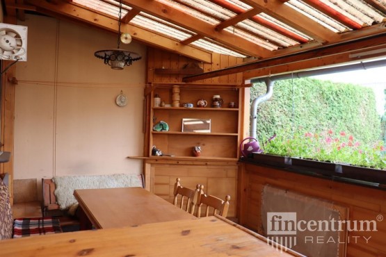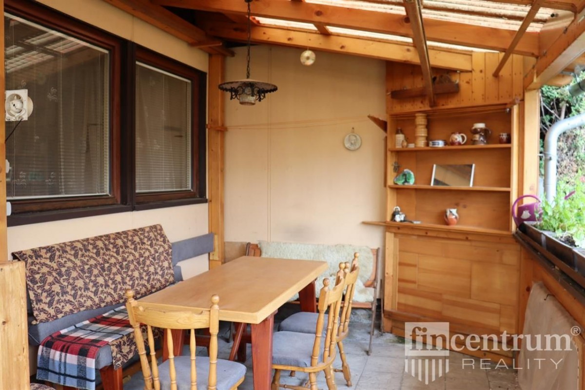 V přízemí z haly vcházíme na krytou terasu s posezením, která se dá úplně uzavřít a můžete zde takřka celoročně stolovat a odpočívat v úplném soukromí. Na optimálně velké, přilehlé zahradě stojí plechová stavba rozdělená na tři samostatné části s vlastním vchodem a sklepem.