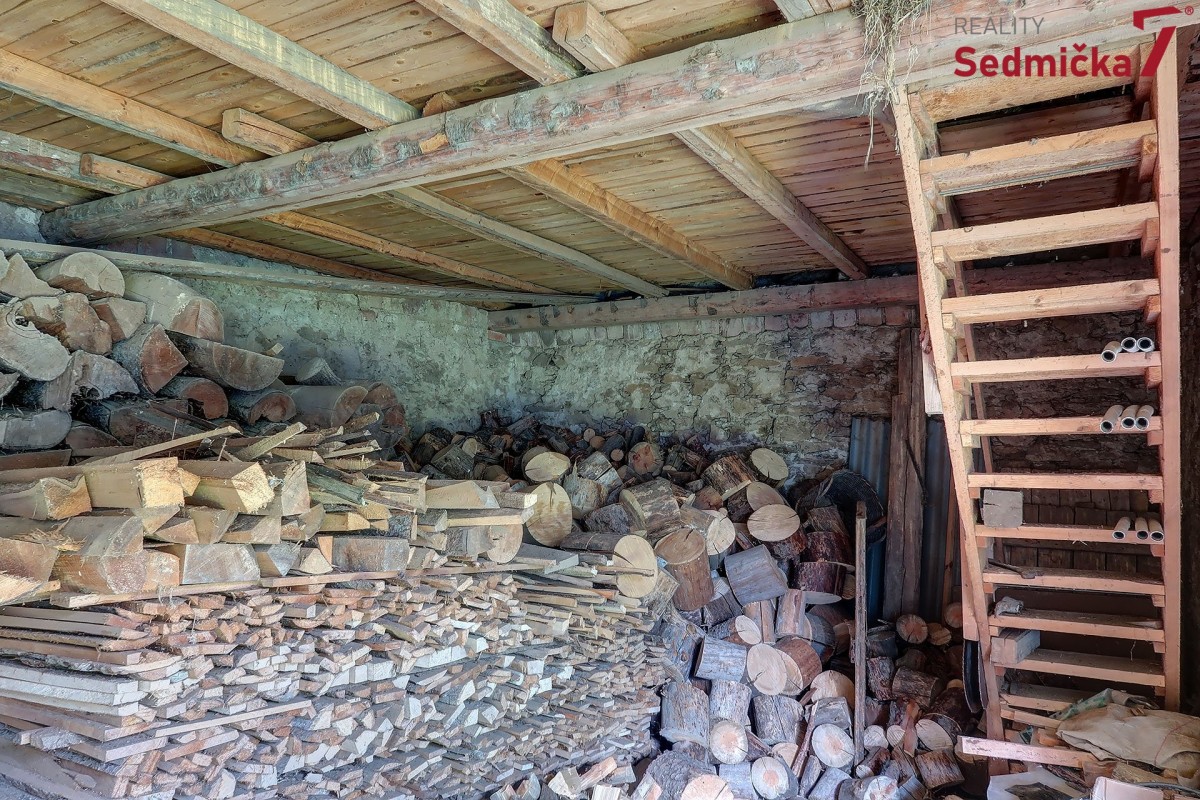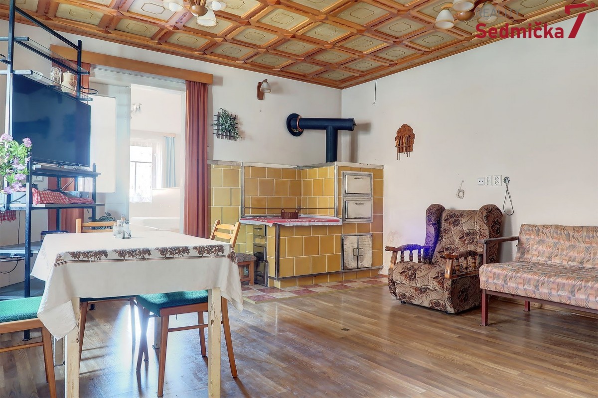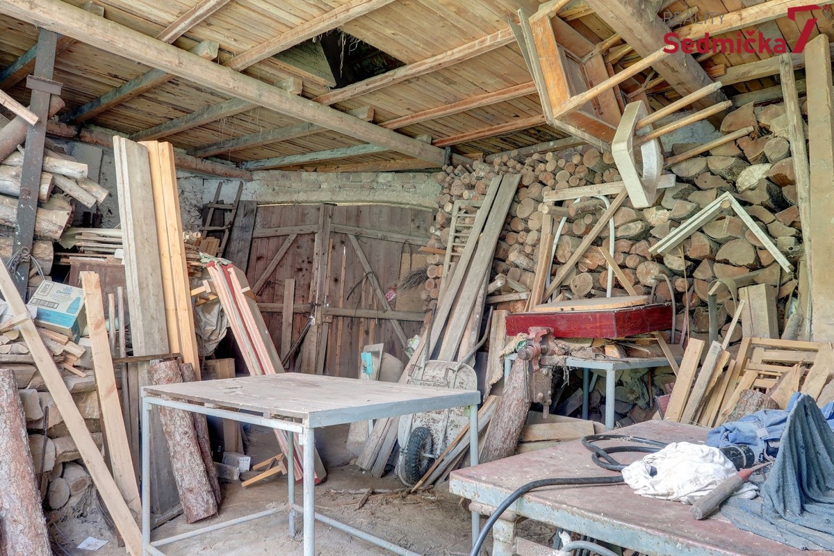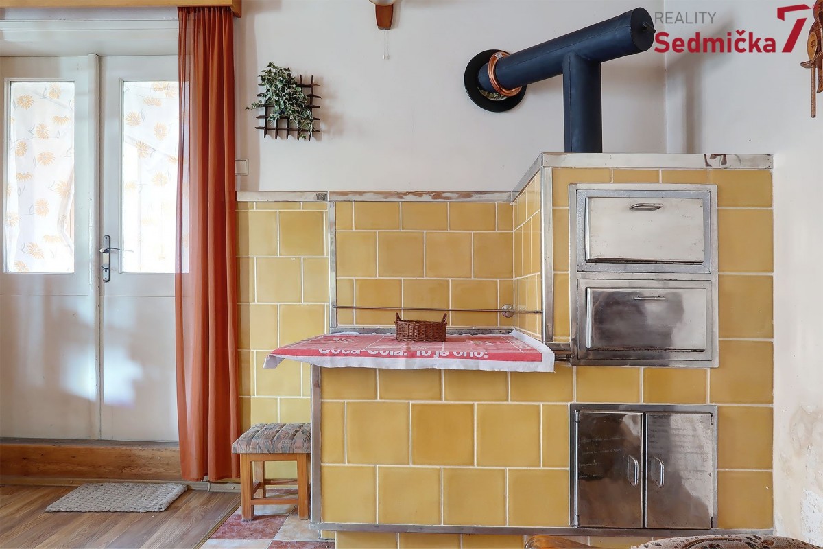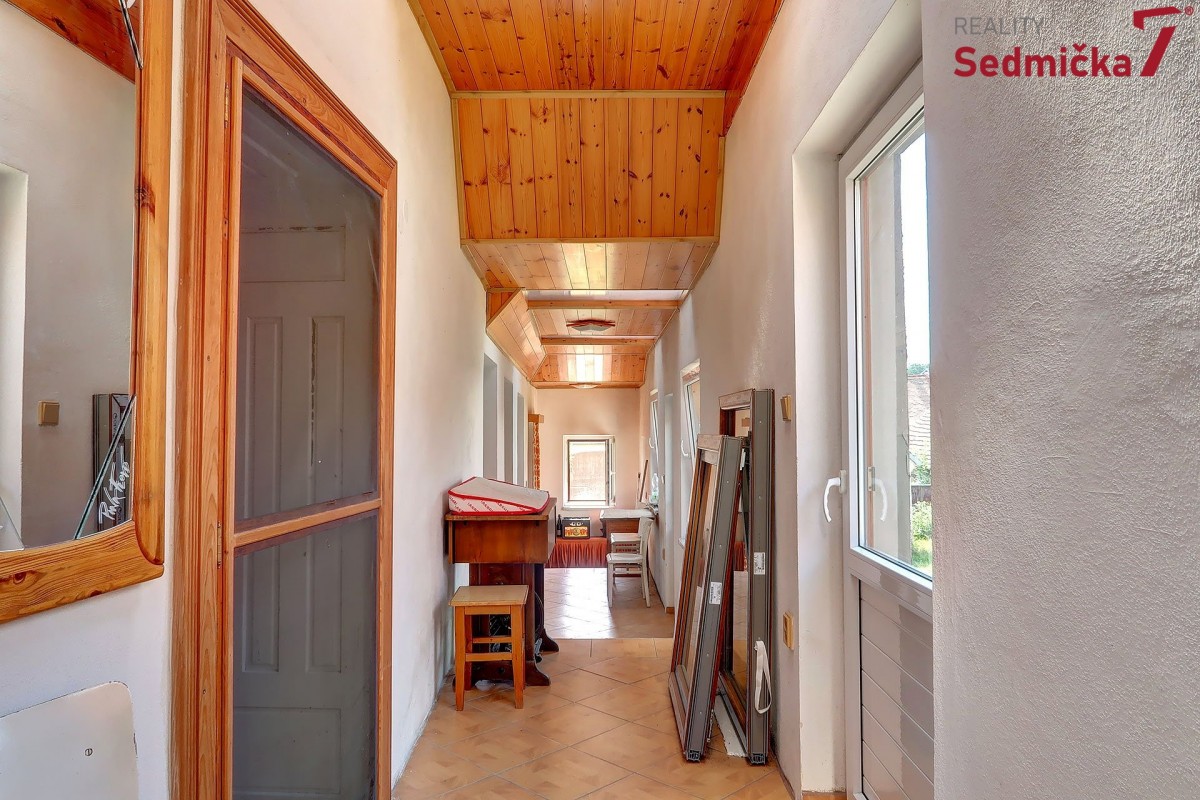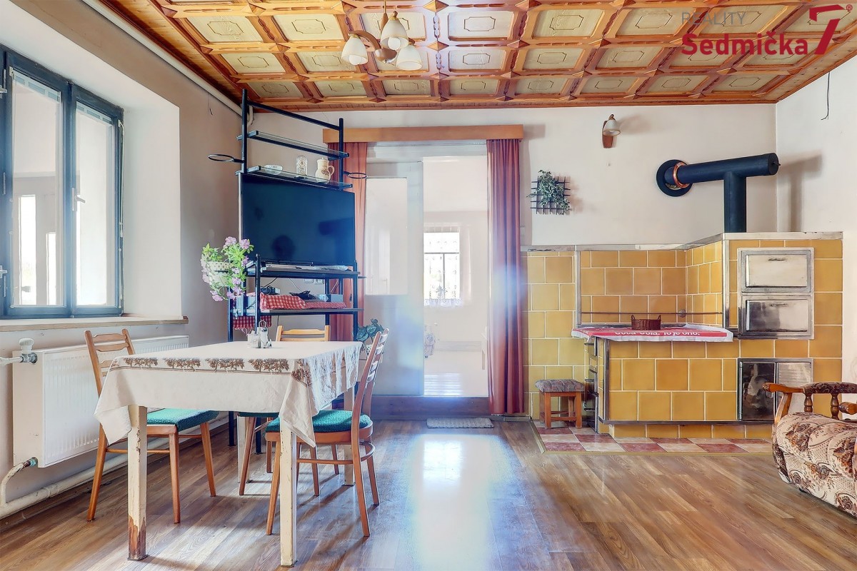 Dům s dílnou, stodolami a dalšími hospodářskými stavbami tvoří uzavřený areál, kde můžete mít naprosté soukromí - pozemek 1 138 m². Hned za vstupními dveřmi vás čeká nově postavená zděná zateplená veranda s plastovými okny i dveřmi. Z ní se dostaneme buď rovnou do obývacího pokoje s kachlovými kamny, do chodby, odkud můžeme pokračovat do kuchyně, do koupelny, na sociální zařízení WC, nebo do dalšího malého obytného prostoru. Poslední vchod z verandy vede do kotelny, kde najdeme kotel na TP, elektrický bojler a rozestavěnou druhou koupelnu.