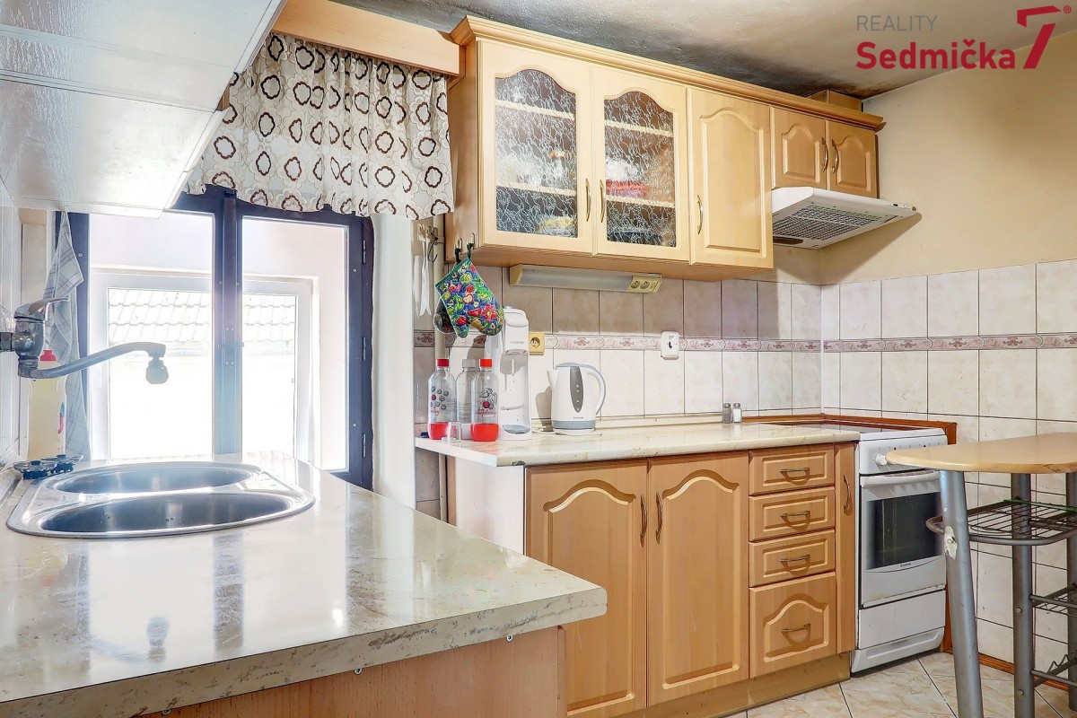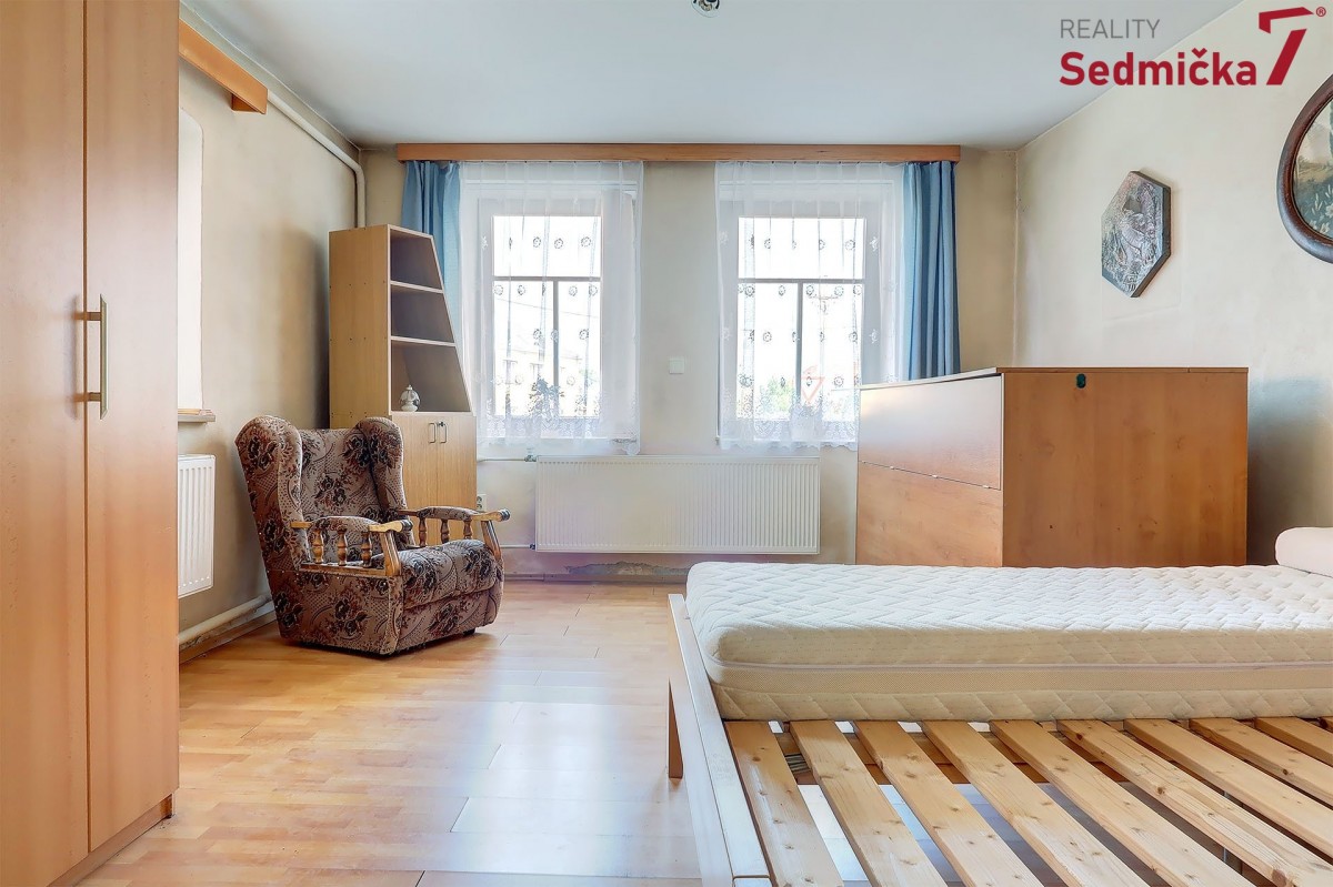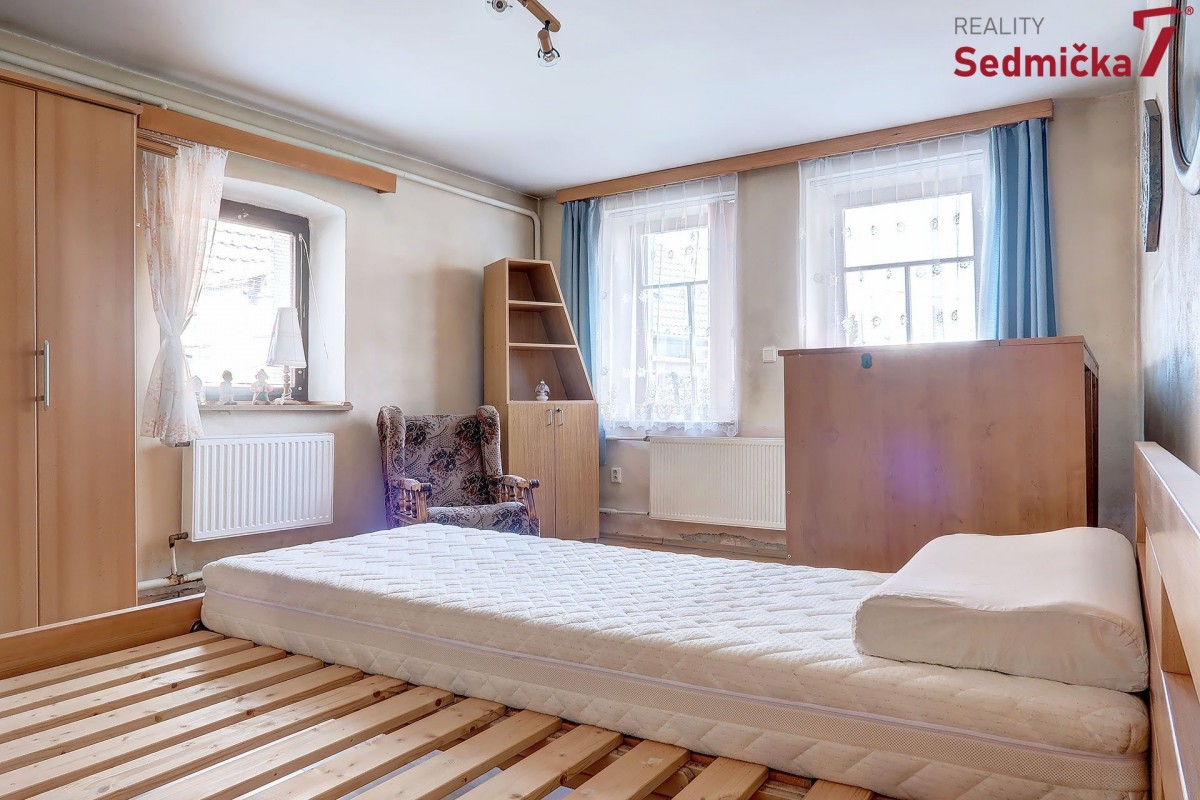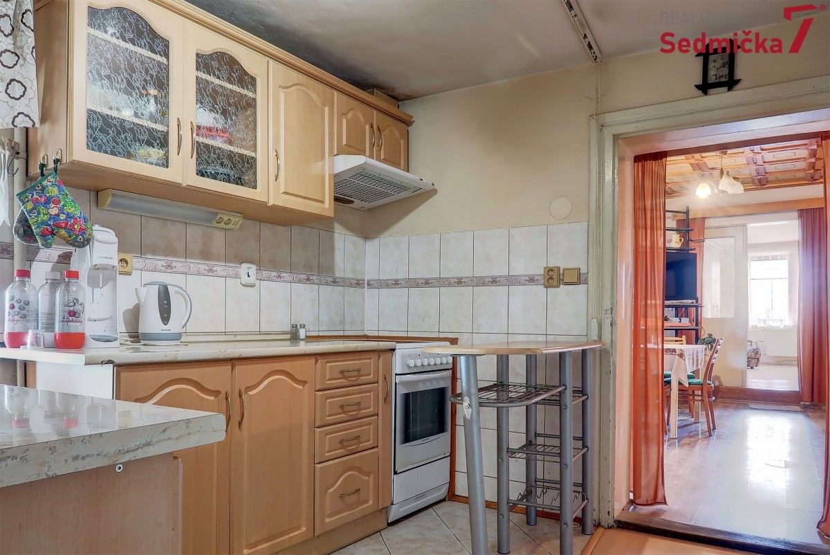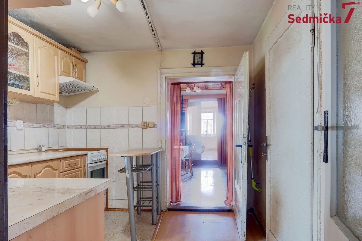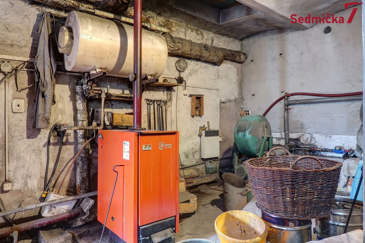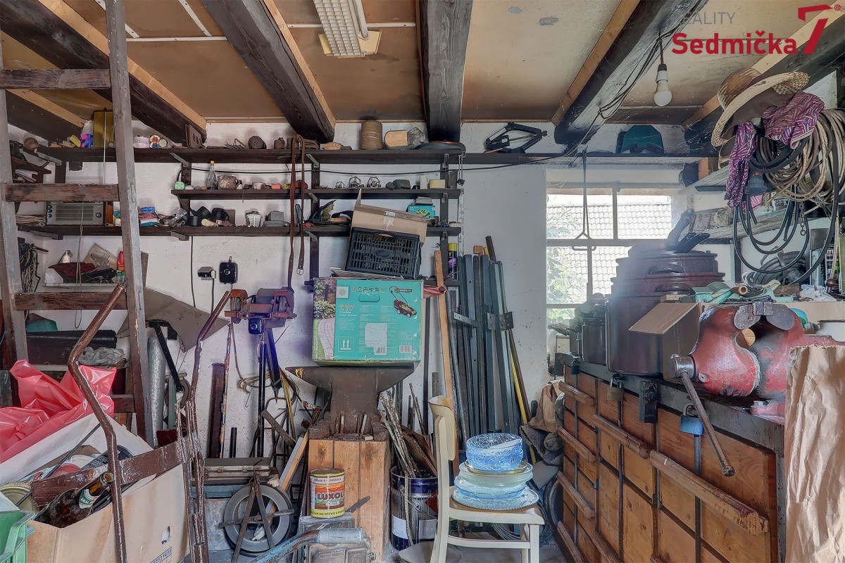 Dům s dílnou, stodolami a dalšími hospodářskými stavbami tvoří uzavřený areál, kde můžete mít naprosté soukromí - pozemek 1 138 m². Hned za vstupními dveřmi vás čeká nově postavená zděná zateplená veranda s plastovými okny i dveřmi. Z ní se dostaneme buď rovnou do obývacího pokoje s kachlovými kamny, do chodby, odkud můžeme pokračovat do kuchyně, do koupelny, na sociální zařízení WC, nebo do dalšího malého obytného prostoru. Poslední vchod z verandy vede do kotelny, kde najdeme kotel na TP, elektrický bojler a rozestavěnou druhou koupelnu.
