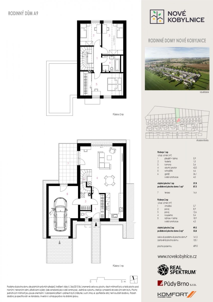 1. NP (první nadzemní patro): vstupní chodba (5, 9 m2), obývací pokoj s kuchyňským koutem (42, 0 m2), komora (3, 4 m2), sociální zařízení WC (1, 5 m2), schodiště (4, 6 m2), garáž (26, 1 m2), terasa (14, 4 m2)