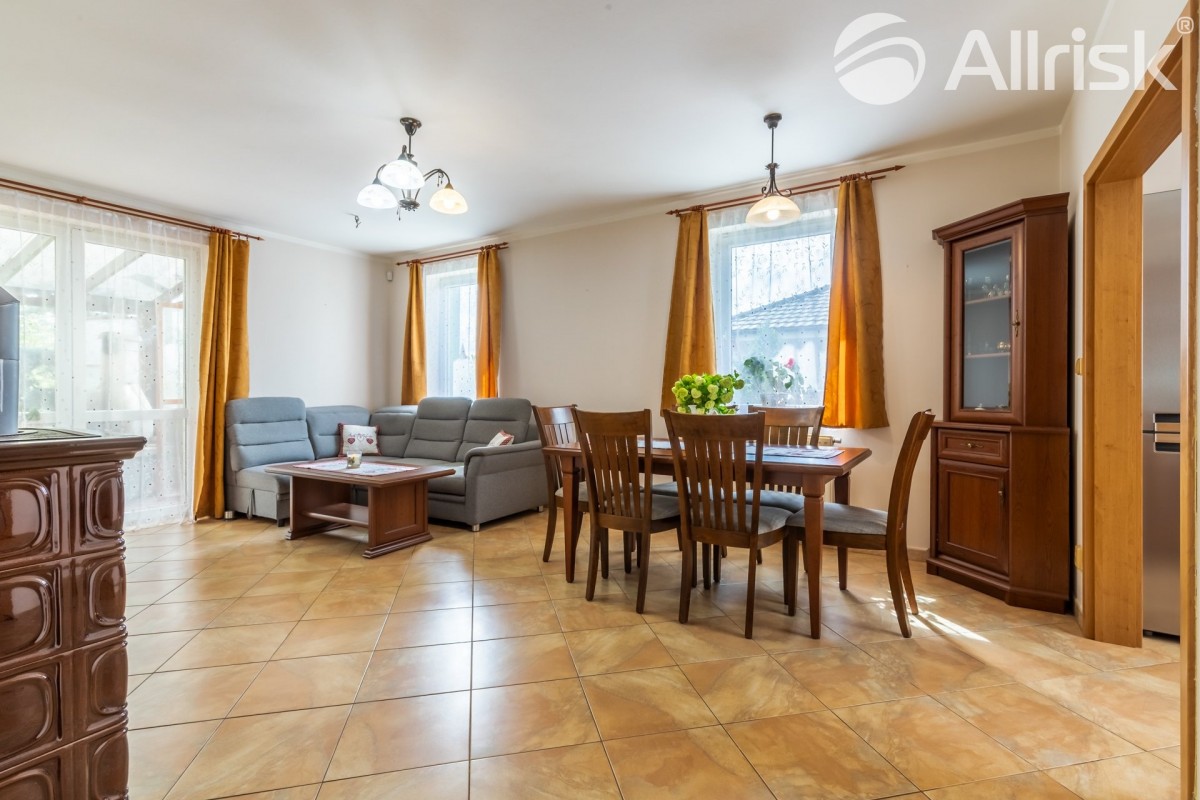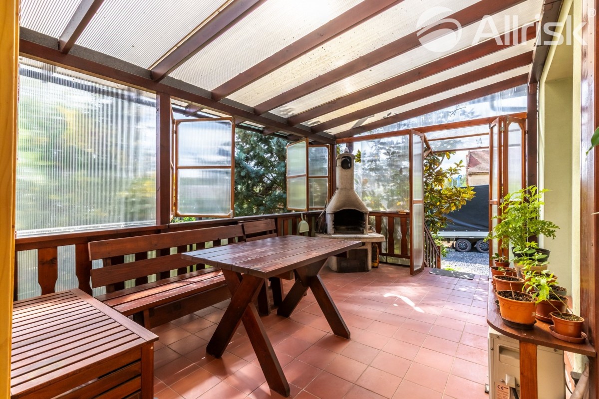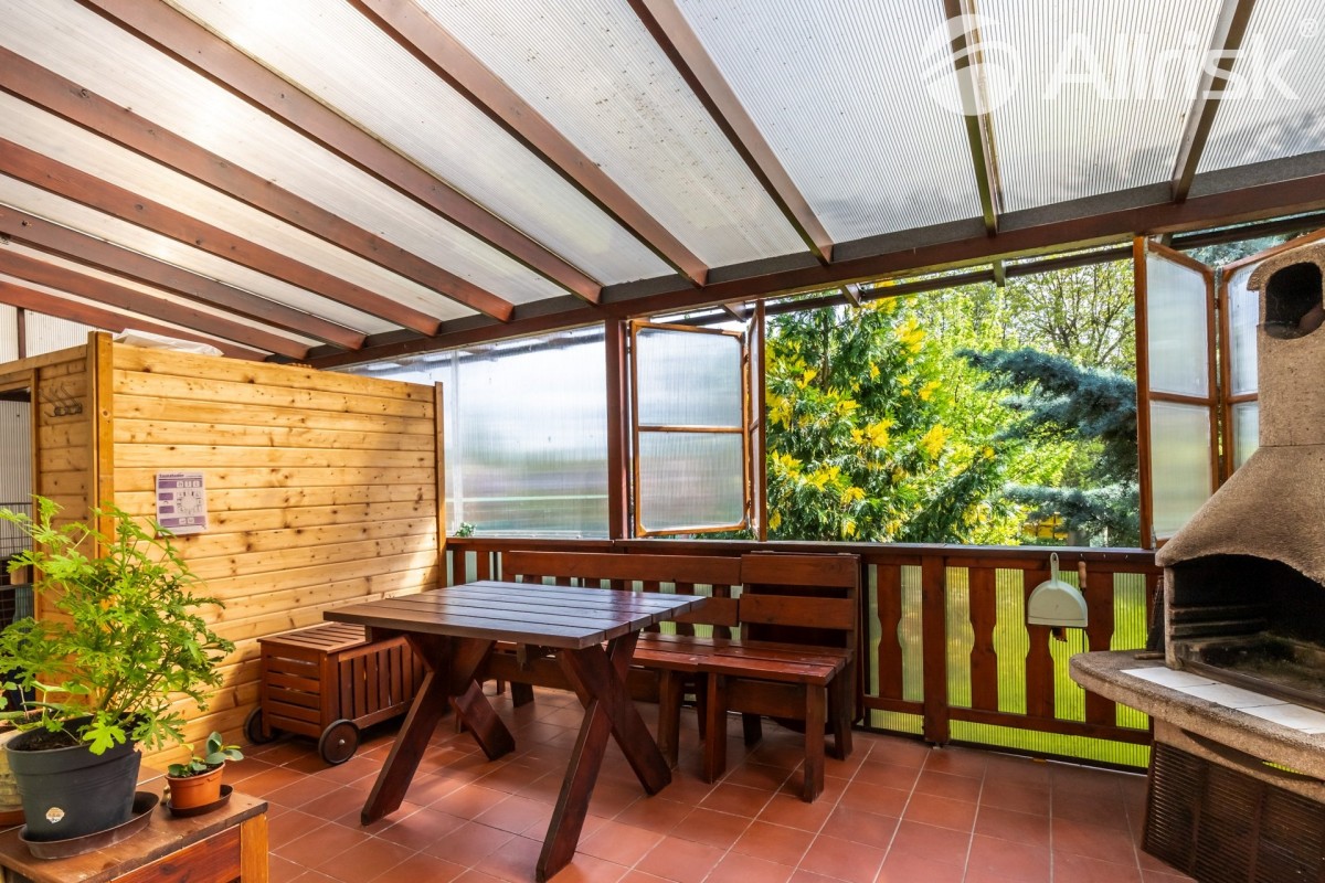 Z nádvoří... domu vstoupíte do zádveří, na které navazuje vnitřní prostorná předsíň, odtud vedou dveře do hlavní místnosti domu - obývacího pokoje, příjemně prostorného a světlého, s krbovými kamny. Vedle obývacího pokoje je samostatná kuchyň s oknem vedoucím do dvora. Kuchyň, uspořádaná do "U", je plně vybavená elektrickými spotřebiči a velice praktickou spíží, oddělenou dveřmi. Z obývacího pokoje vedou dveře do místnosti, která je nyní využívaná jako pracovna, může ale sloužit také jako pokoj pro hosty, či jedna z ložnic. Velmi hezká je na obývací pokoj navazující zastřešená obytná terasa s vnitřní saunou, příjemným posezením a venkovním krbem.