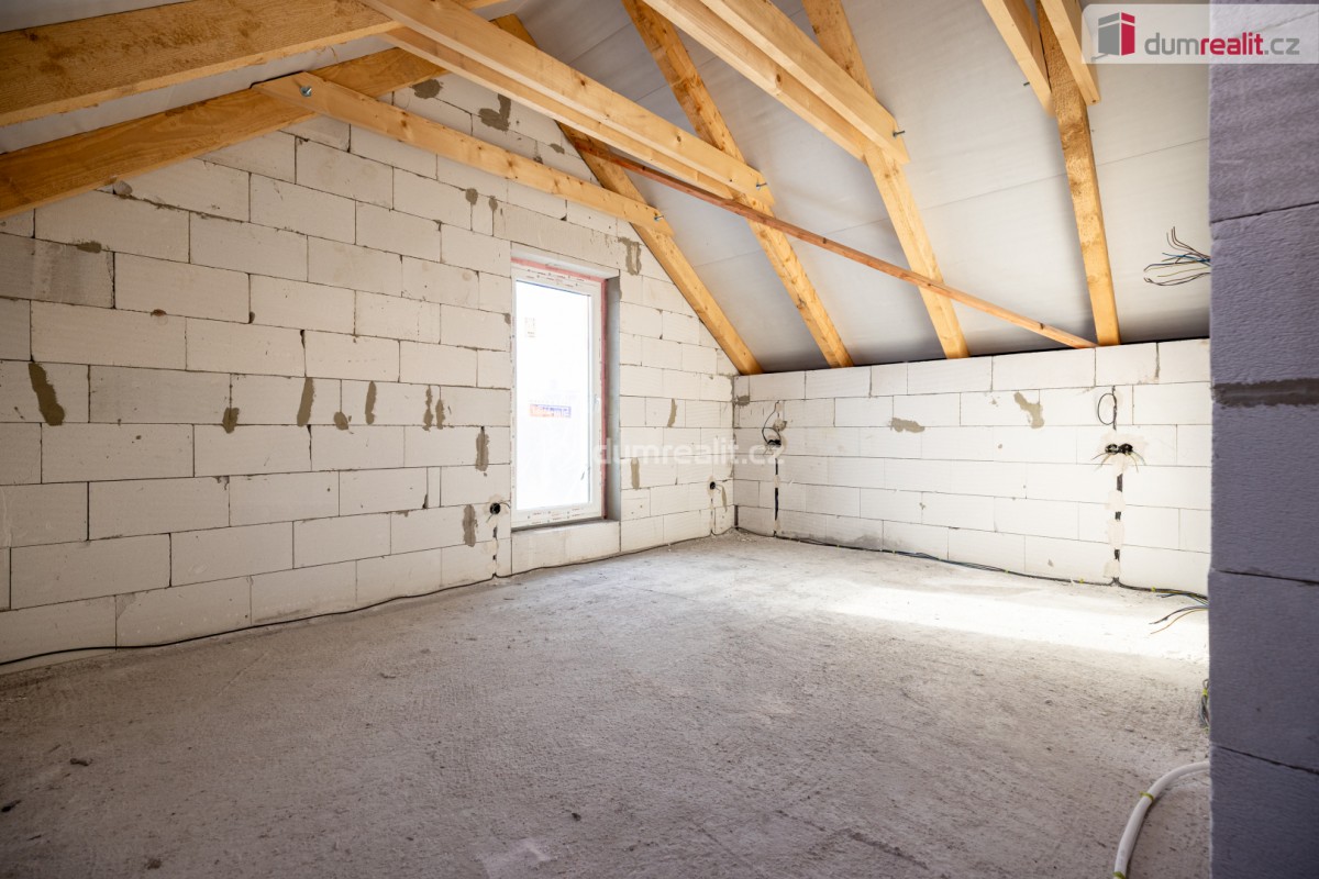 V patře domu, pod střechou (stříkaná izolace) jsou dva velké pokoje, další koupelna, toaleta a šatna.