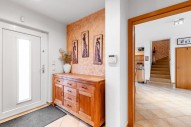 V obývacím prostoru naleznete krb obložen pískovcem a je zde přímý vstup na zahradní terasu.