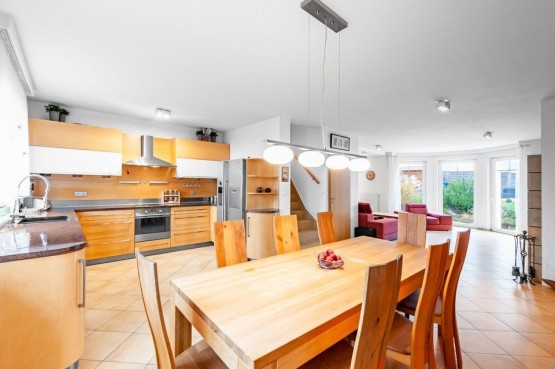 Dispozice domu 5kk se skládá ze vstupní haly, technické místnosti + sociální zařízení WC a sprchou, komory a nedílnou součástí je prostorná obývací část, která je spojena s kuchyní a jídelnou. Kuchyň má vestavěné spotřebiče a dvoukřídlou chladničkou.
