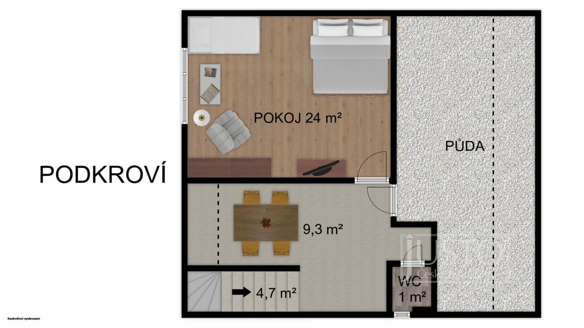 V podkroví je otevřená hala, která nyní slouží jako jídelna či společné posezení. Dále je zde ložnice a příprava na druhou toaletu. Vedle ložnice je volný půdní prostor, který můžete rozšířit na další obytnou místnost.