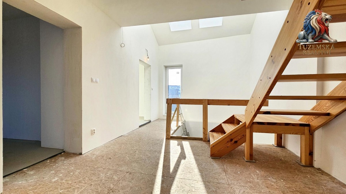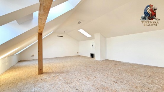 To pravé kouzlo se ukrývá úplně nahoře. Podkroví je obrovský open - space s novým dřevěným trámovým stropem, který zalévá sluncem neuvěřitelných 8 střešních oken. Ideální místo pro gigantickou hernu, ateliér, nebo prostor k rozdělení na dva samostatné pokoje.