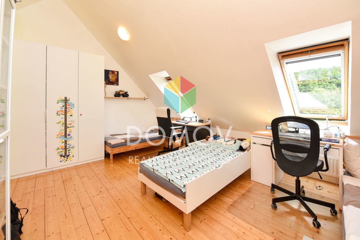 Dům byl dispozičně navržen jako 5+KK, v přízemí najdeme chodbu, toaletu, komoru pod schody, pracovnu a srdce domu - velký obývací prostor s kuchyňskou a jídelní částí. Po dřevěných schodech se z galerie dostanete do 3 pokojů, majitelé mají aktuálně jednu příčku zrušenou a děti mají ze dvou dětských pokojů jeden. V patře je i koupelna s druhou toaletou, bidetem, vanou a sprchovým koutem.