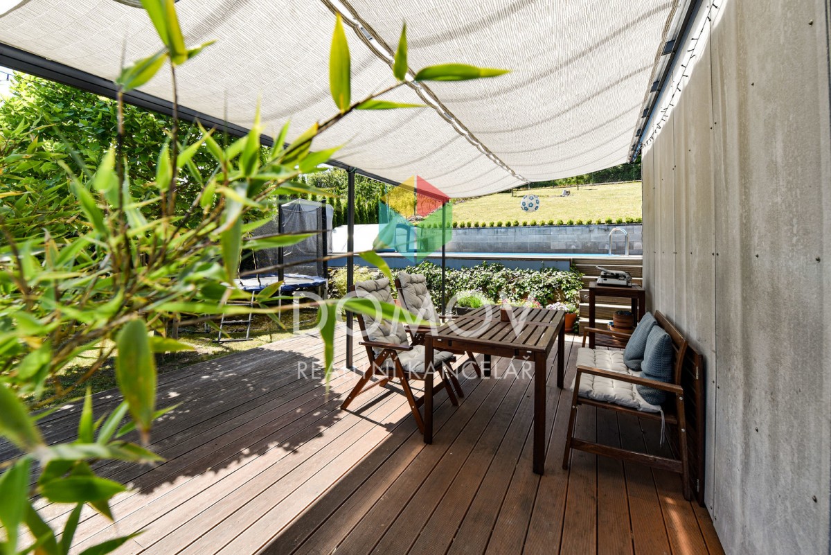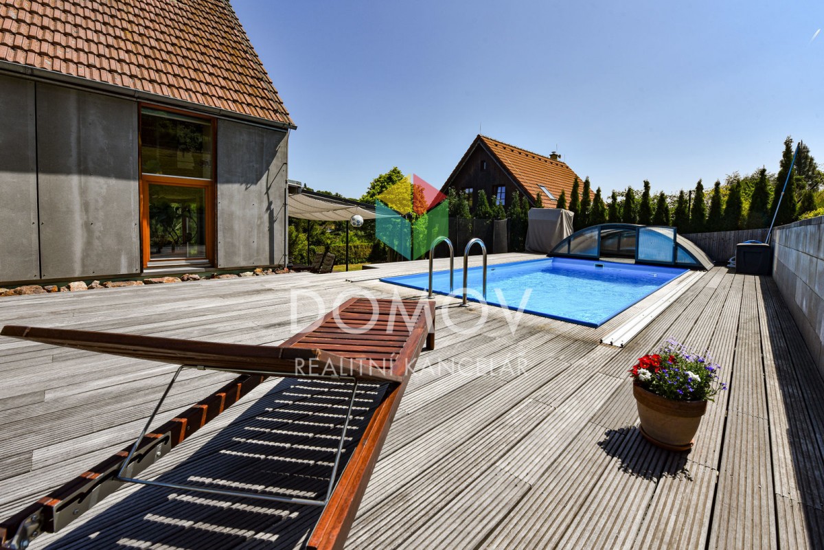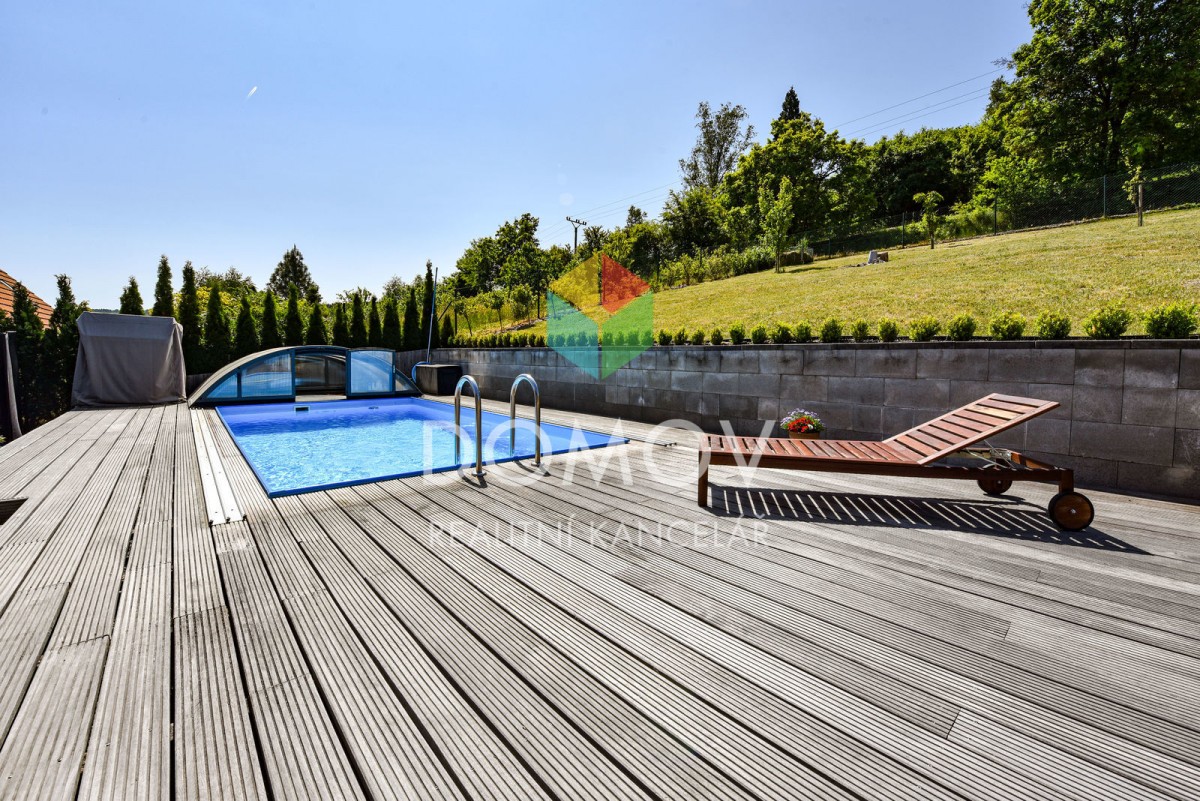 Velkou výhodou je pozemek za domem, který zajišťuje majitelům dostatek soukromí, na něm byla vybudovaná velká terasa s krytým bazénem. Pod domem u silnice je možnost na oploceném pozemku za vraty na el. pohon parkovat dvě auta.