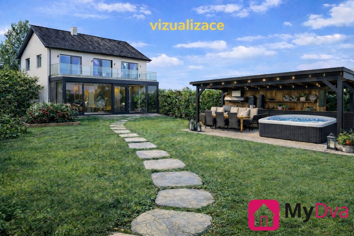 Mezi fotografiemi jsou také vizualizace (ilustrační návrhy), které názorně ukazují možné využití navazující stavební parcely. Přibližují například možnost výstavby dalšího domu (i dvoupodlažního, se zimní zahradou či balkonem) a doplnění zázemí jako pergola, zahradní kuchyň, relaxační zóna, parkování/přístřešek pro auto i napojení příjezdové cesty od hlavní silnice. Vizualizace mají inspirativní charakter.