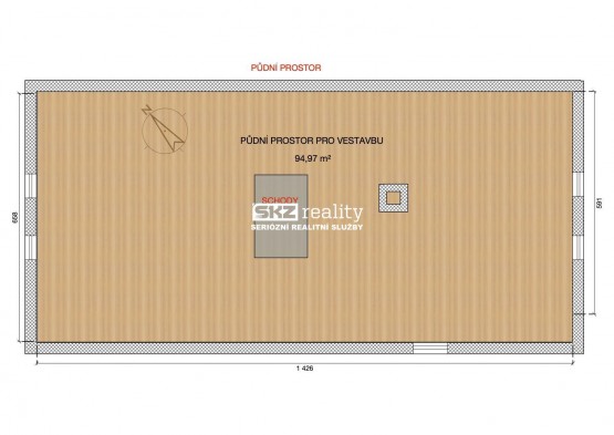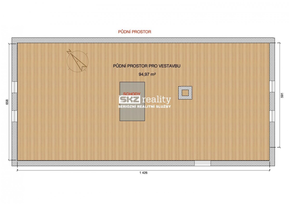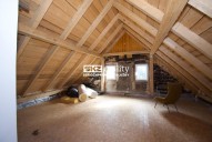 Podkroví je připraveno pro budoucí vestavbu. Ve štítových stěnách jsou již osazena plastová okna a podlaha je vyrovnána OSB deskami. Díky tomu je možné jednoduchou vestavbou výrazně rozšířit obytnou plochu domu a vytvořit další obytné místnosti podle potřeb nového majitele.