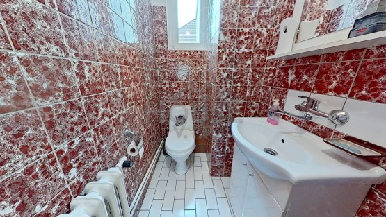 Tento dům, který byl postaven v roce 1984, je napojen na veškeré inženýrské sítě, včetně elektřiny na 220/380V. Přízemí dominuje slunný obývací pokoj o velikosti 27, 3 m2, který disponuje balkonem (2, 5 m2) a je propojený s kuchyní (11, 3 m2) vybavenou moderní kuchyňskou linkou se zabudovanými elektrospotřebiči. Nachází se zde také pokoj pro hosty (12, 5 m2), koupelna s vanou a samostatné sociální zařízení WC.