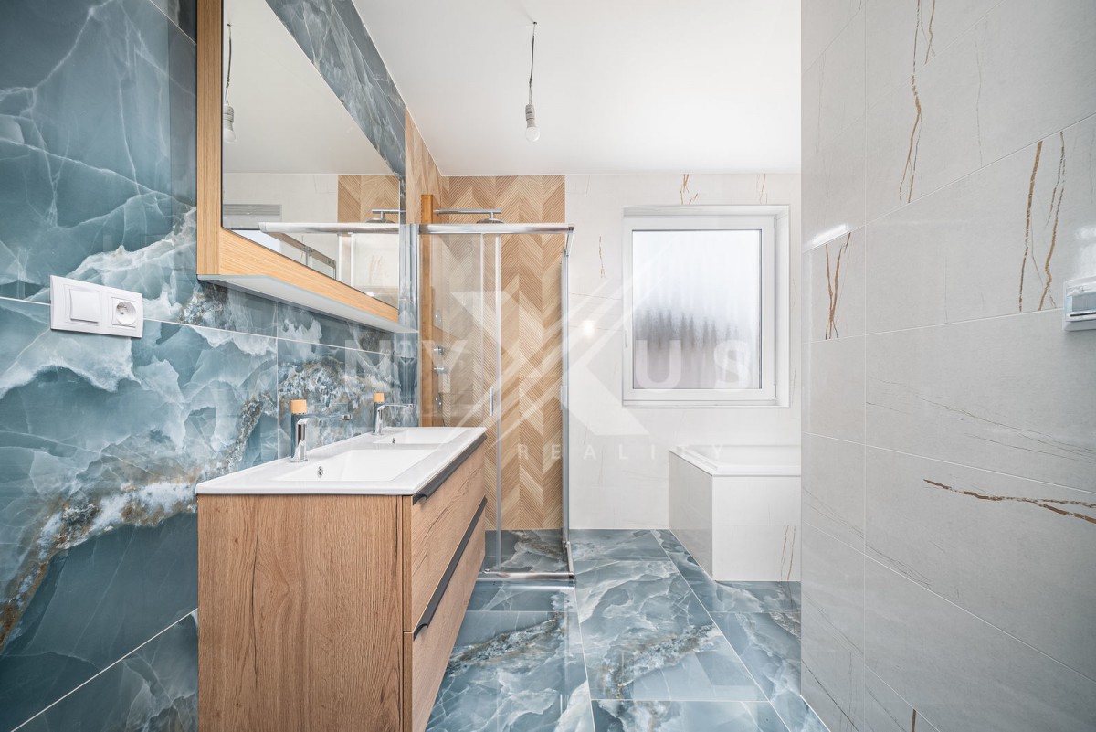 Koupelna je vybavena dvoj - umyvadlem, sprchovým koutem, vanou i toaletou. Kuchyňská linka značky Bosch obsahuje moderní vestavěné přístroje a spoustu úložného prostoru. V obývacím pokoji je příprava na krb a lze z něj vstoupit na vydlážděnou terasu. Obývací pokoj s terasou a největší částí zahrady jsou orientovány na jihozápad, díky čemuž je zde po celý den spousta světla. Zahrada včetně parkování a terasy má výměru 827 m2.
