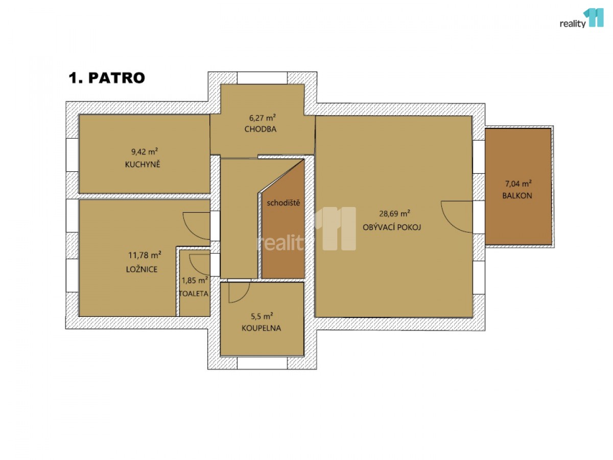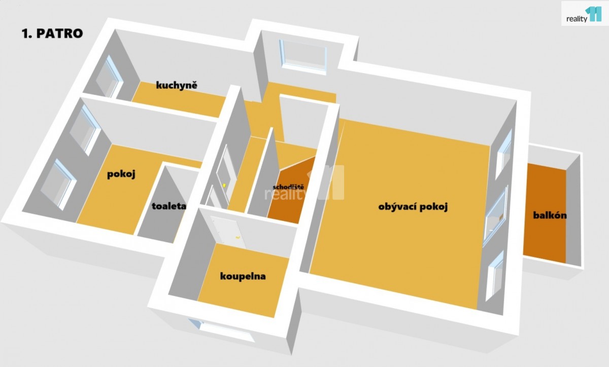 • 1. patro (2. nadzemní podlaží) má vlastní kuchyň, prostorný obývací pokoj s balkonem orientovaným do zahrady, ložnici, druhou koupelnu a toaletu. Díky samostatnému vstupu po schodišti lze toto patro využívat jako samostatnou bytovou jednotku.