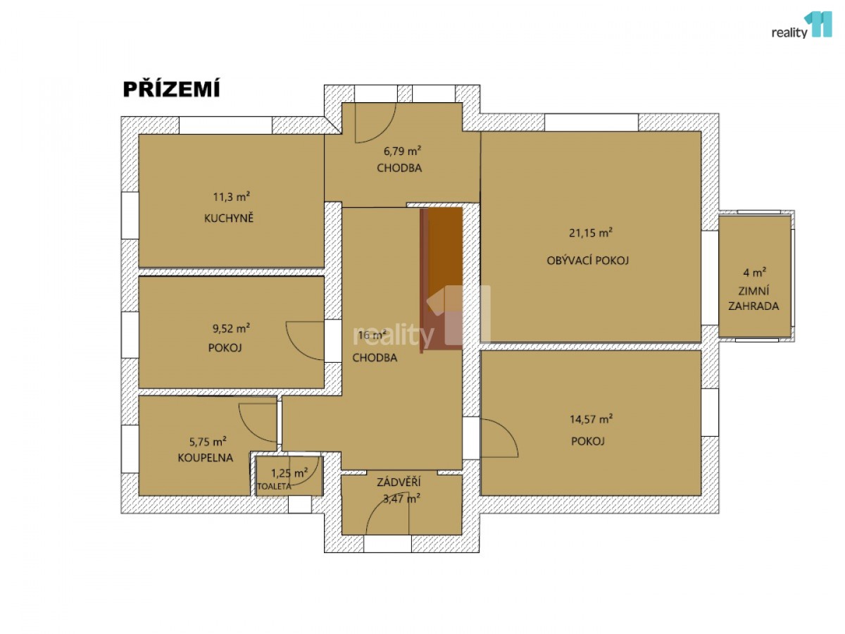 • Suterén o ploše 99 m² zahrnuje dvougaráž, velkou prádelnu, technickou místnost a další tři víceúčelové místnosti, které lze využít jako dílnu, sklad nebo domácí wellness/fitness.