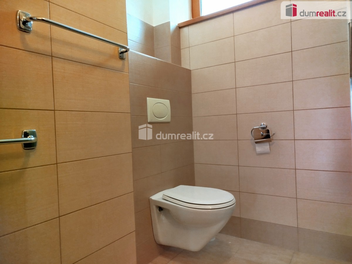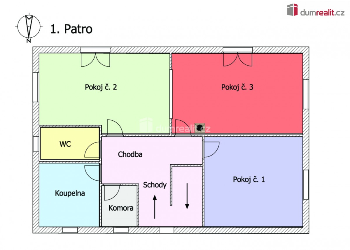 V 1. NP (první nadzemní patro) je chodba, samostatná koupelna, samostatné sociální zařízení WC, komora a tři pokoje, přičemž dva pokoje jsou oddělené dřevěnými posuvnými dveřmi, takže se dají pokoje propojit v jeden velký.