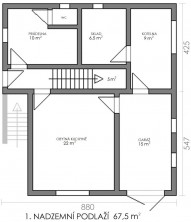 Dům byl postaven v 80. letech. Jedná se o kombinaci zděného 1. nadzemního podlaží a 2. nadzemního podlaží a podkroví, které jsou z ocelové nosné konstrukce a panelů, střecha je sedlová. 1. NP (první nadzemní patro) má dva vstupy a je převážně technické, obsahuje kotelnu, sklad paliva, prádelnu se sprchou a sociální zařízení WC, garáž a větší 22 m2 rozlehlou místnost, kde byla umístěna i kuchyňská linka. 2. NP (druhé nadzemní patro) je přístupné vnitřním i venkovním schodištěm s verandou, kdy z centrální schodišťové chodby jsou přístupné samostatně všechny místnosti, obývací pokoj 28 m2 se vstupem na velkou terasu přes celou šíři domu, pokoj, komora, samostatné sociální zařízení WC a koupelna. V podkroví jsou situovány 2 ložnice, přičemž ta větší má přístup na druhou terasu. (vnitřní rozměry domu jsou přibližné)