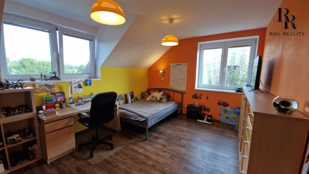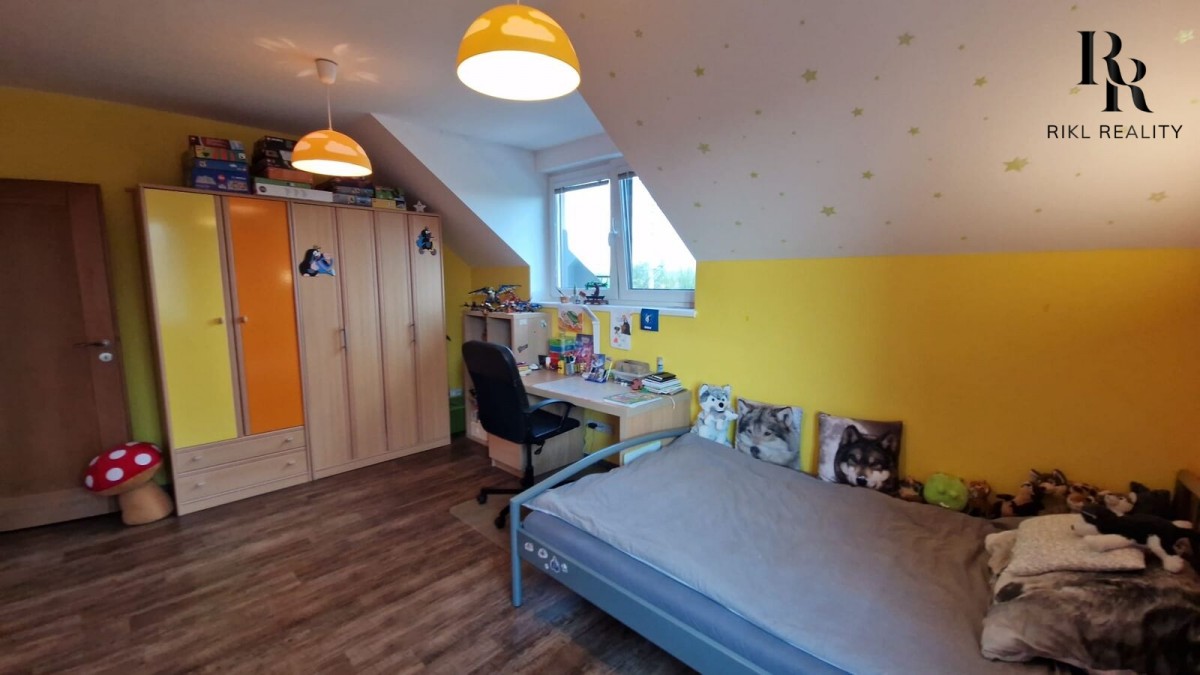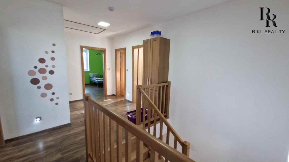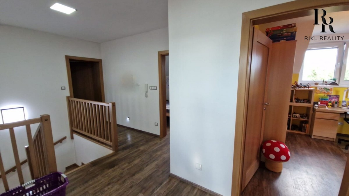 Patro je královstvím odpočinku s třemi dětskými pokoji, ložnicí a velkou koupelnou. Kvalitní dřevěné prvky dodávají celému domu útulnou atmosféru.