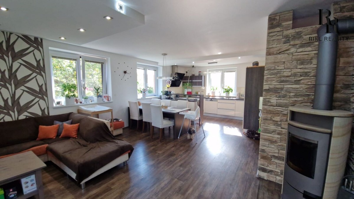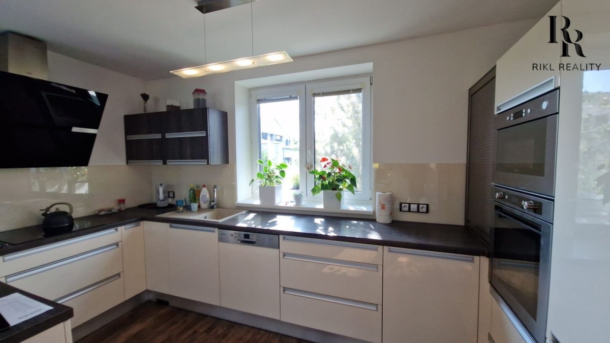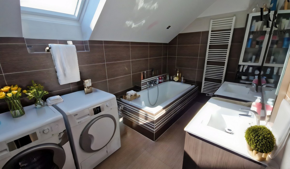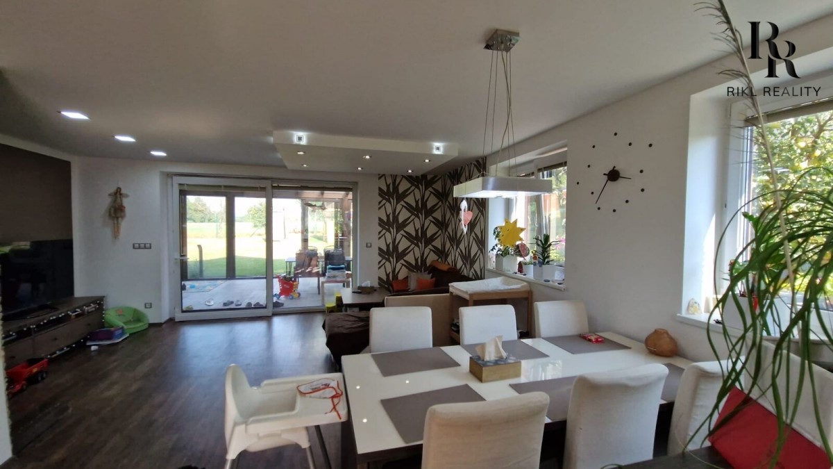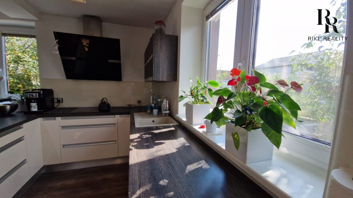 Interiér domu vás okouzlí promyšleným designem. V přízemí najdete prostorný obývák propojený se zimní zahradou - perfektní místo pro rodinná setkání v každém ročním období. Kuchyň potěší každého kuchaře, a pokoj pro hosty zajistí pohodlí vašim návštěvám.