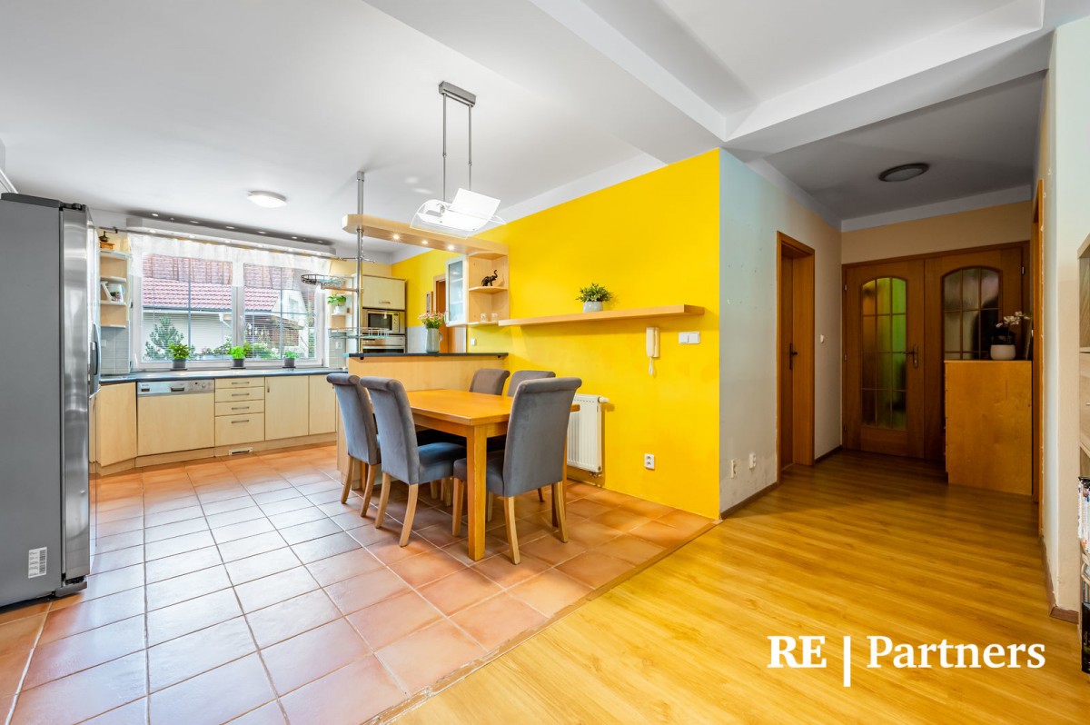 Dispozice domu: vstupní chodba s velkou vestavnou šatní skříní velikosti 5, 4 m2, chodbička směřující do garáže, která má 22, 25 m2 a kam se pohodově vejde jedno větší auto a zbyde stále místo na odkládání věcí, samostatné sociální zařízení WC pro návštěvy - 1, 85 m2, pracovna - 12, 8 m2, ložnice - 12, 8 m2, velký obývací pokoj - 36, 8 m2 s přímým vstupem na terasu o velikosti 64, 3 m2 směřující na jihozápadní stranu, která nabízí absolutní klid a pohodlí. Krásně zde svítí sluníčko po celý den. Dále pak obývací pokoj volně navazuje na jídelní prostor a kuchyňský kout velikosti 20, 55 m2, který má u sebe menší skládek na potraviny či jiné věci - 1, 7 m2. Chodbou se pak dostáváme do dvou dětských pokojů - oba velikosti 17, 45 m2, jejichž okna směřují na jihozápadní a na východní stranu, volně pak přecházíme do prostorné koupelny s vanou, sprchovým koutem, dvěma umyvadly a sociální zařízení WC velikosti 16 m2. I v koupelně je vstup do menšího prostoru, který slouží jako úložný. Z koupelny se pak vracíme zpět do obývacího prostoru. Poslední místností je prostor, kde je plynový kotel, další sprchový kout, pračka se sušičkou a další úložný prostor velikosti 6, 7 m2.