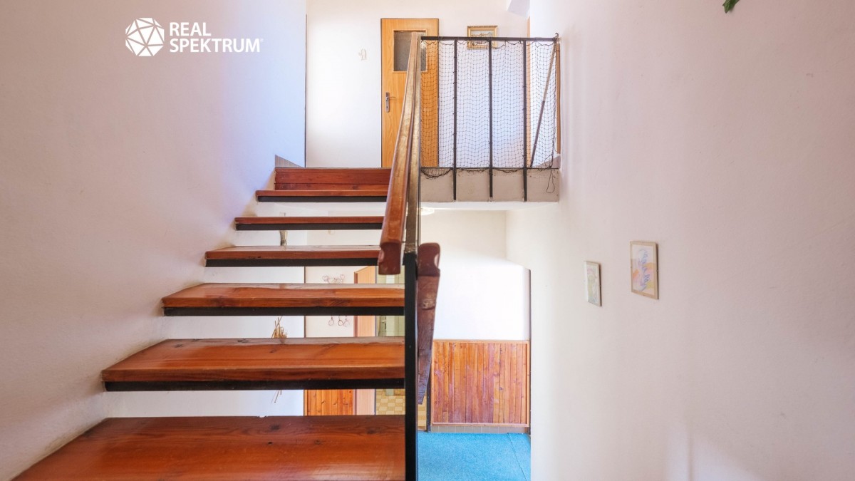 Vstupní podlaží tvoří prostorný obývací pokoj se vstupem do zahrady, kuchyně, toaleta a vstupní hala. V patře se nacházejí tři ložnice a koupelna, půdní prostor je přístupný po schodišti a lze jej upravit na další obytné místnosti. Dům je plně podsklepen – sklepní prostory nabízejí dostatek místa pro technické zázemí, skladování nebo dílnu. Součástí domu je také garáž s přímým vstupem z ulice.