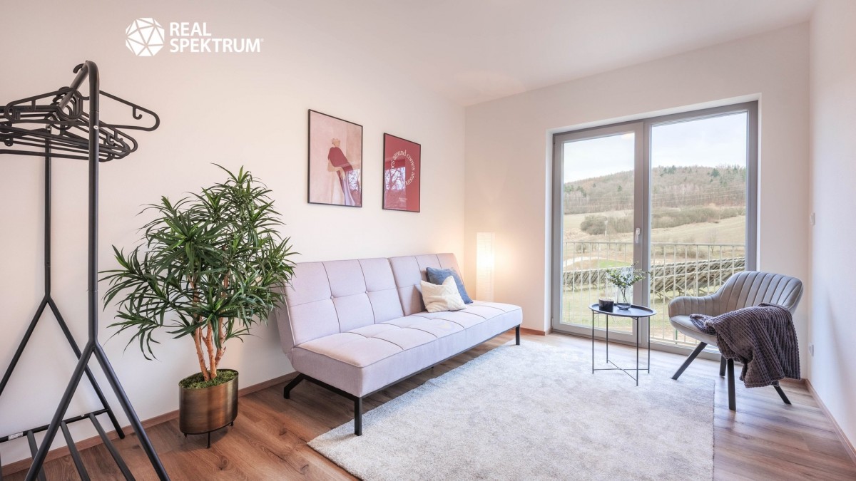 1. NP (první nadzemní patro): hala (8, 5 m²), obývací pokoj s kuchyňským koutem (32, 3 m²) a vstupem na terasu (15, 3 m²), pokoj (15, 4 m²), pokoj (11, 6 m²), ložnice (19, 3 m²) s terasou (4, 3 m²), koupelna s sociální zařízení WC (5, 7 m²)