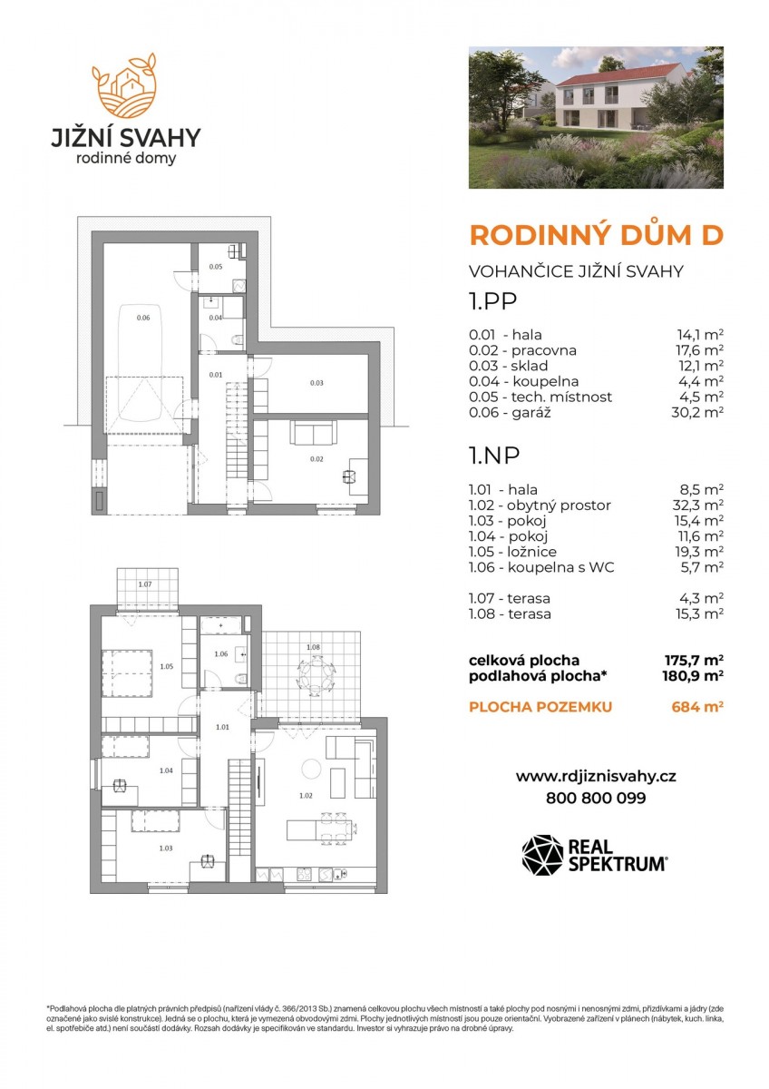 1. NP (první nadzemní patro): hala (8, 5 m²), obývací pokoj s kuchyňským koutem (32, 3 m²) a vstupem na terasu (15, 3 m²), pokoj (15, 4 m²), pokoj (11, 6 m²), ložnice (19, 3 m²) s terasou (4, 3 m²), koupelna s sociální zařízení WC (5, 7 m²)
