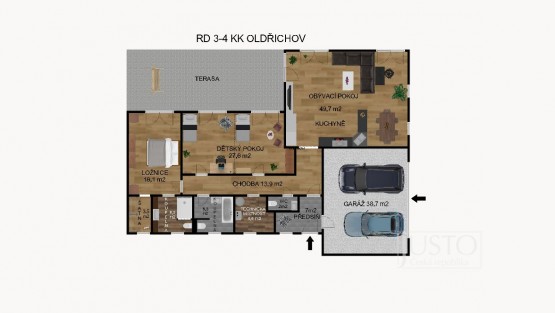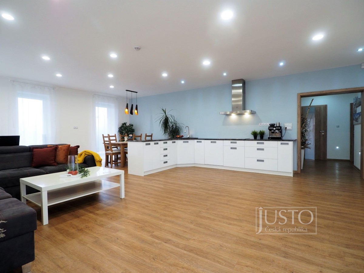 Velmi dobře promyšlené dispoziční řešení nabízí vysoký komfort bydlení. Při vstupu do domu se nachází praktická předsíň s úložným prostorem o výměře 7 m², odtud je přístupná i dvojgaráž o výměře 38, 7 m².