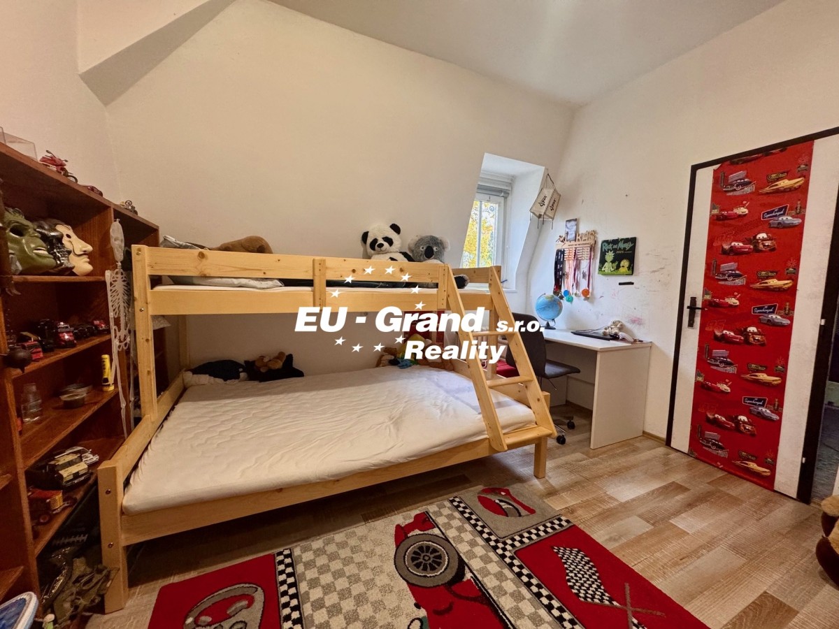 V patře je koupelna s sociální zařízení WC, ložnice se vstupem na balkon, dva dětské pokoje, šatna a pracovna.