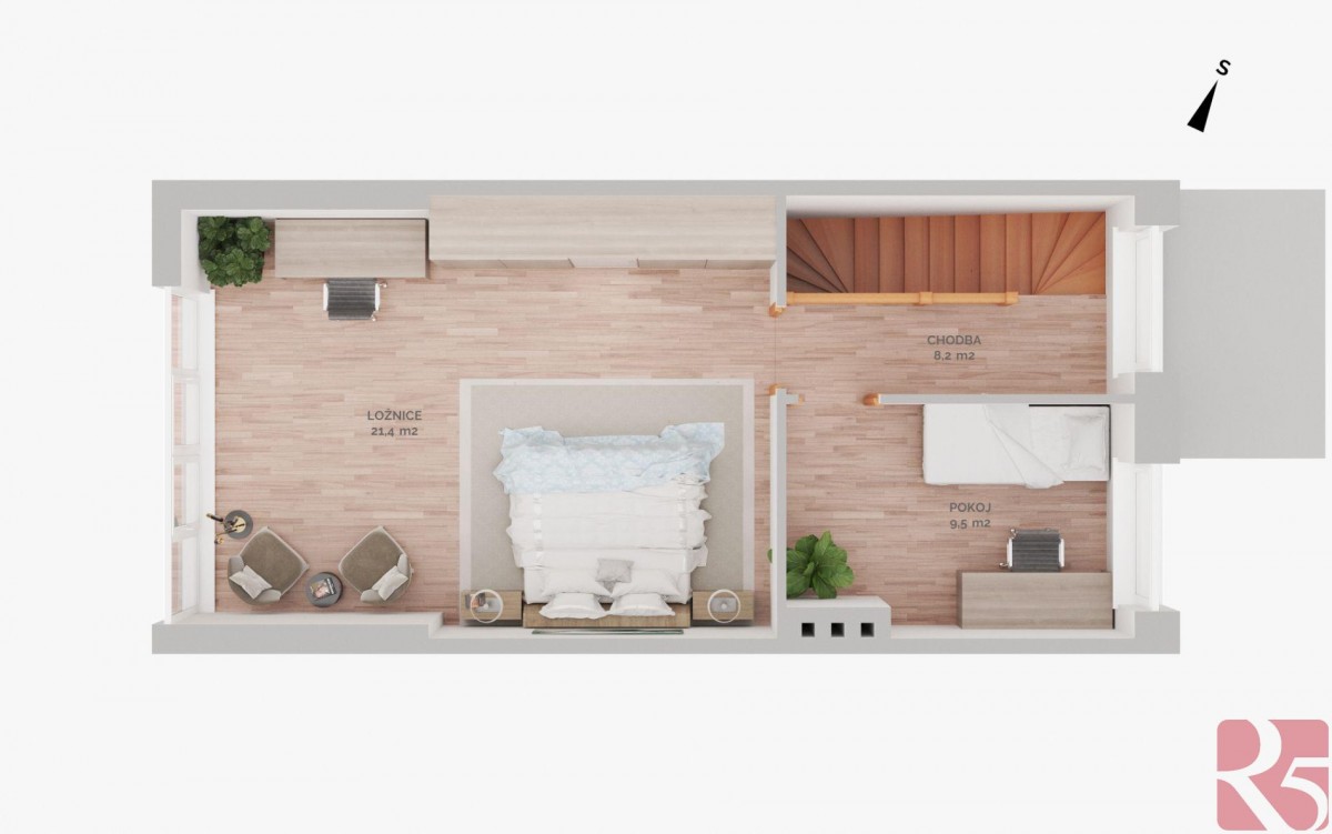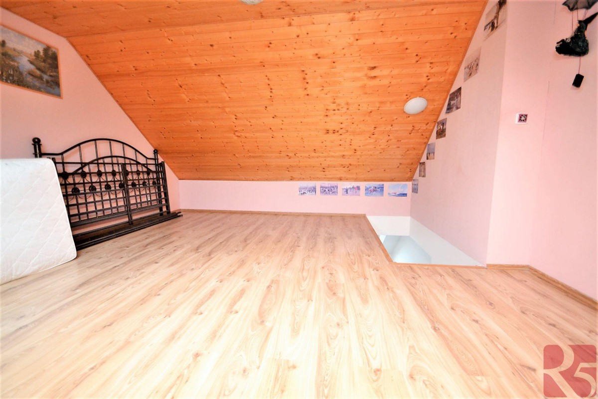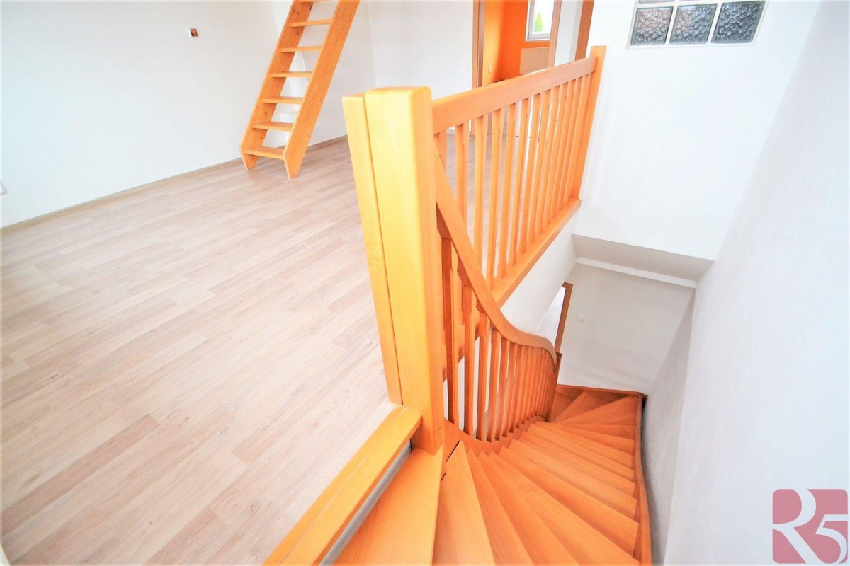V prvním patře dva pokoje, dále vystoupáte do druhého patra, kde najdete druhou koupelnu s toaletou a prostorný pokoj orientovaný do zahrady a open space se vstupem do podkroví, lze vytvořit další místnost a získat tak samostatnou jednotku.