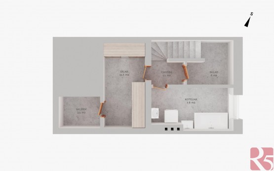 V suterénu třetí koupelna - prádelna, skladovací prostor na potraviny a dílna. Najdete zde i sklep a místo třeba na saunu.