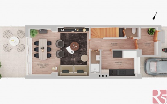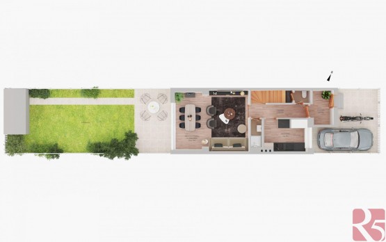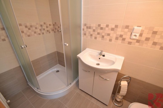 V přízemí domu vstupní hala, kuchyně, koupelna se sprchou a toaleta. Obývací pokoj se vstupem na zahradu, kde najdete místo na bazén, zahradní domek pro uskladnění potřebných věcí. Dlážděnou terasu lze zastínit výsuvnou markýzou a užít si příjemné posezení i za slunečných dní.