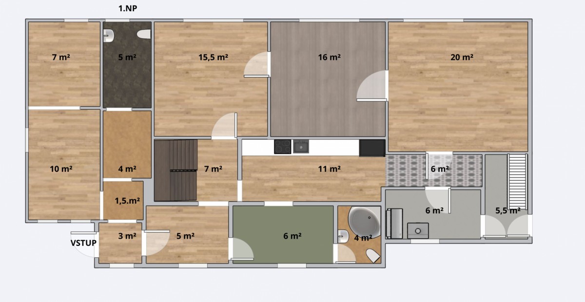 Skládá se z 6 velkých pokojů + kuchyně + koupelny s vanou, samostatného sociální zařízení WC a několika dalších menších místností (komory, šatny apod. ).