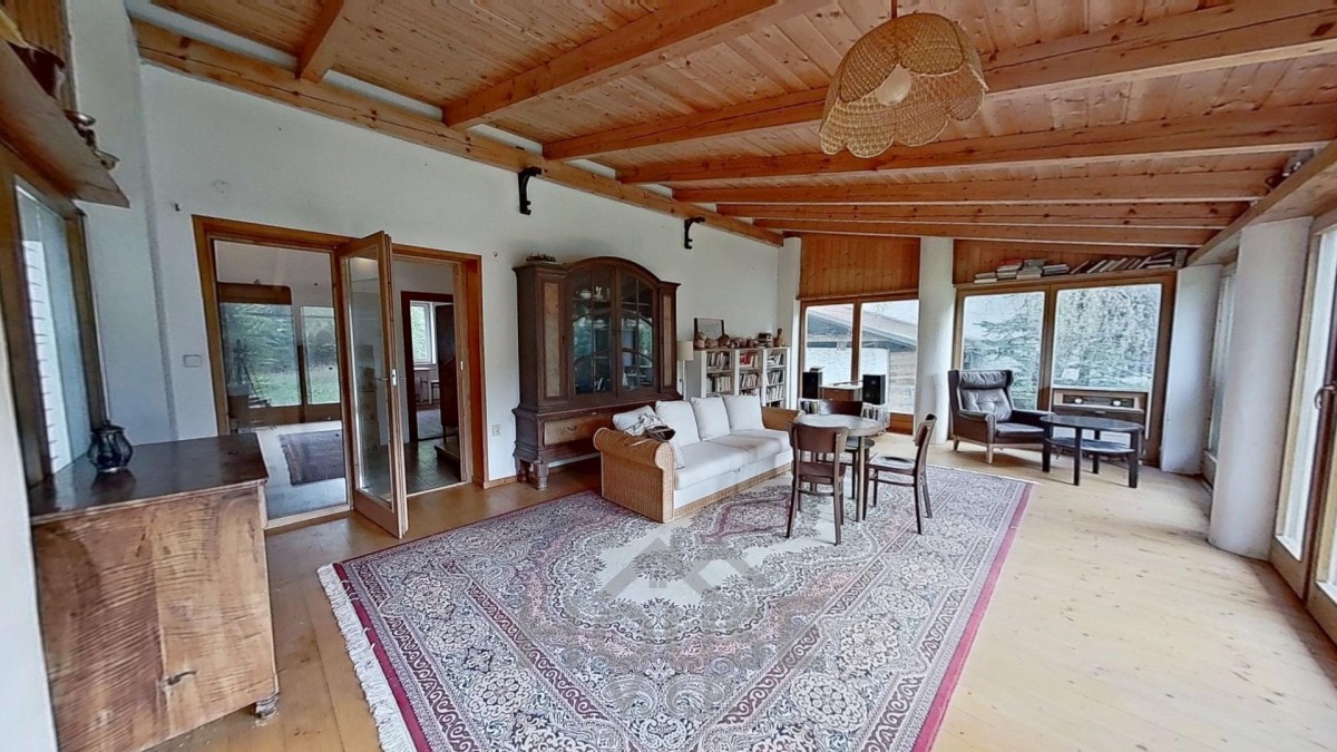 V přízemí se nachází obývací prostor s kachlovými kamny, kuchyňský kout, další obytná místnost a navazující obytná zimní zahrada s výhledem na rybník – ideální místo pro relaxaci v každém ročním období. Dále se zde nachází koupelna se sprchovým koutem a menší technická místnost.