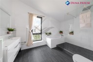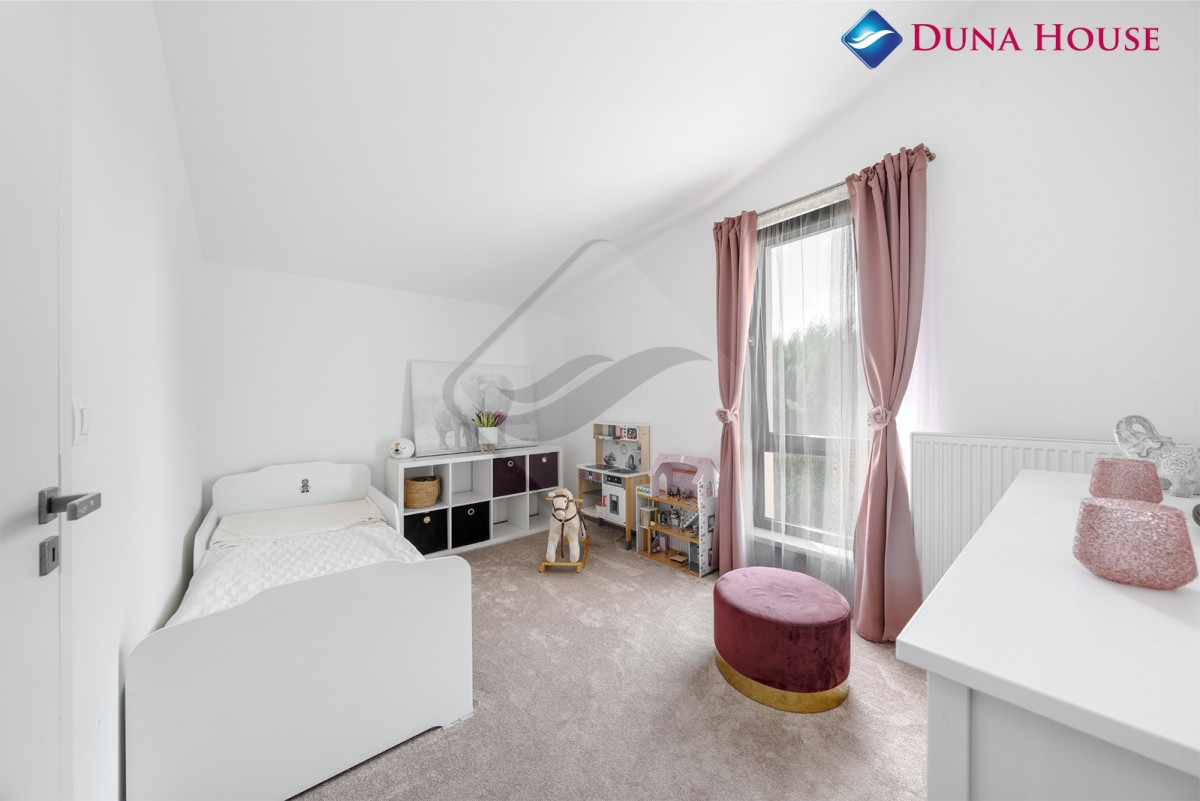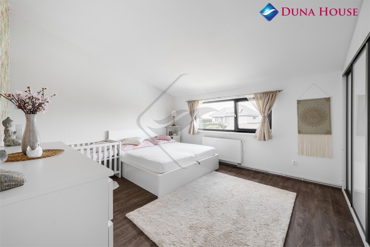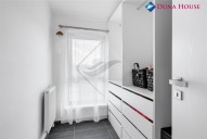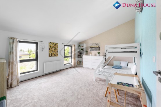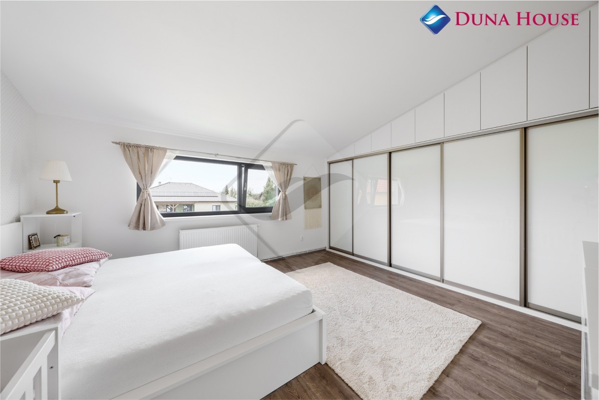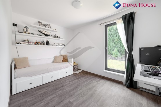 V druhém podlaží pak kromě velké, druhé koupelny najdeme ložnici osazenou velice prostornou, precizně provedenou vestavěnou skříní. Vedle koupelny najdeme šatnu a vetší dětský pokoj. Naproti koupelně pak najdeme i druhý, menší dětský pokoj.