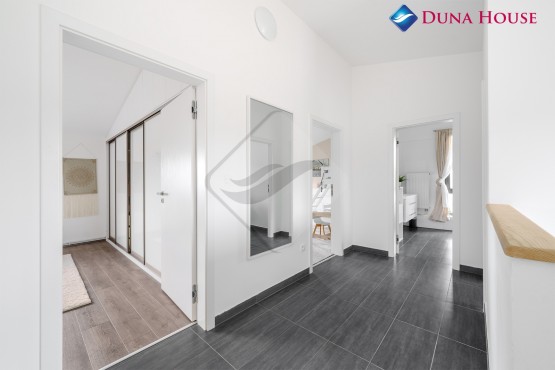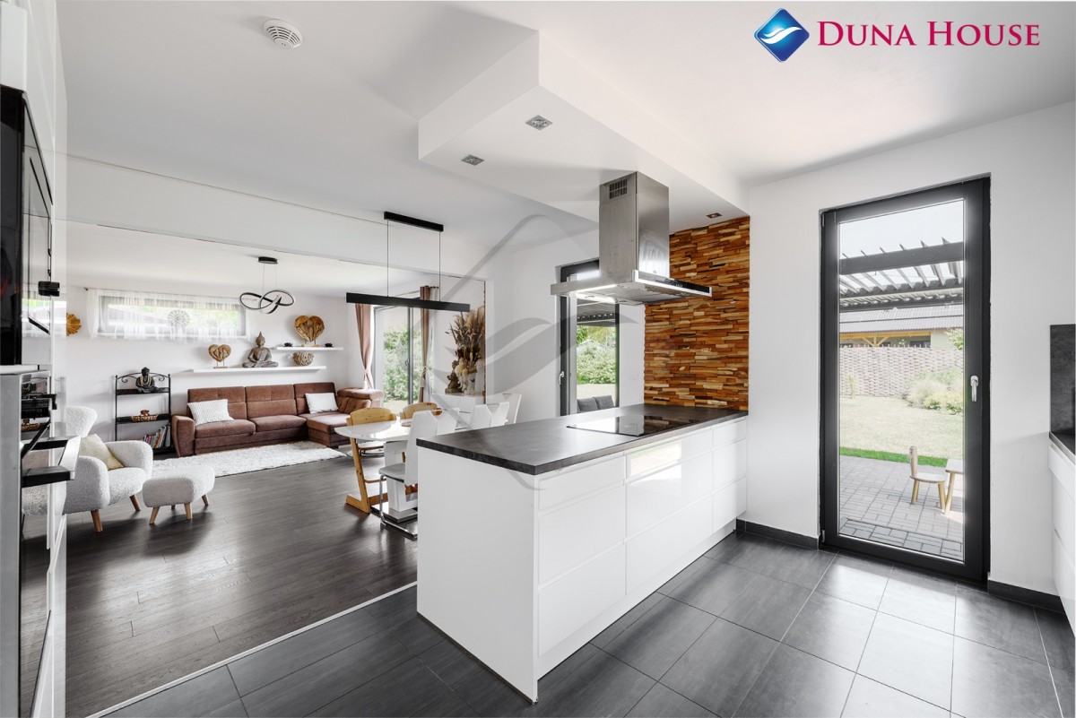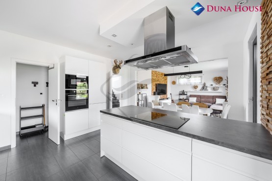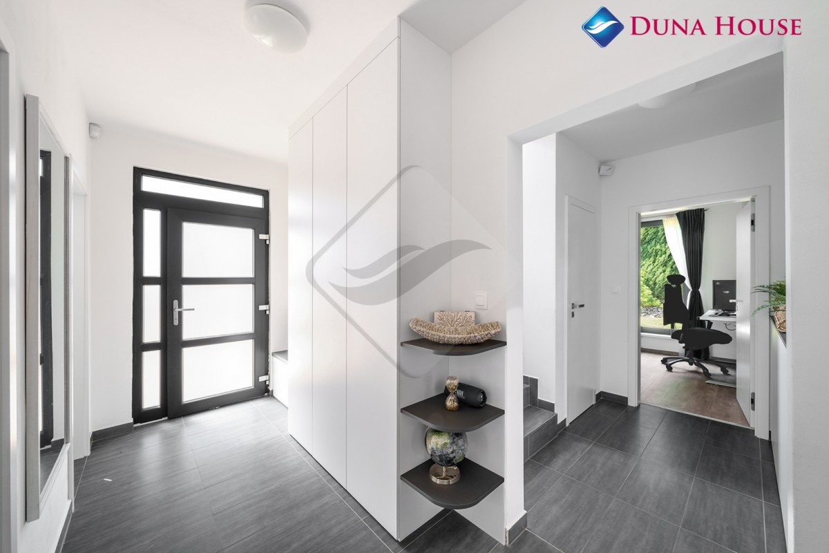 Dům je dispozičně řešen jako 5+kk s několika dalšími místnostmi. Za hlavním vchodem následuje chodba s prostornou vestavěnou skříní na odložení svršků a bot. Napravo od hlavního vstupu je koupelna a technická místnost osazená velkým bojlerem a technologií pro tepelné čerpadlo a chytrou fotovoltaiku. Nalevo od vchodu je schodiště do prvního patra a vchod do pokoje pro hosty. Obývák je spojený s kompletně a luxusně vybavenou prostornou kuchyňí.