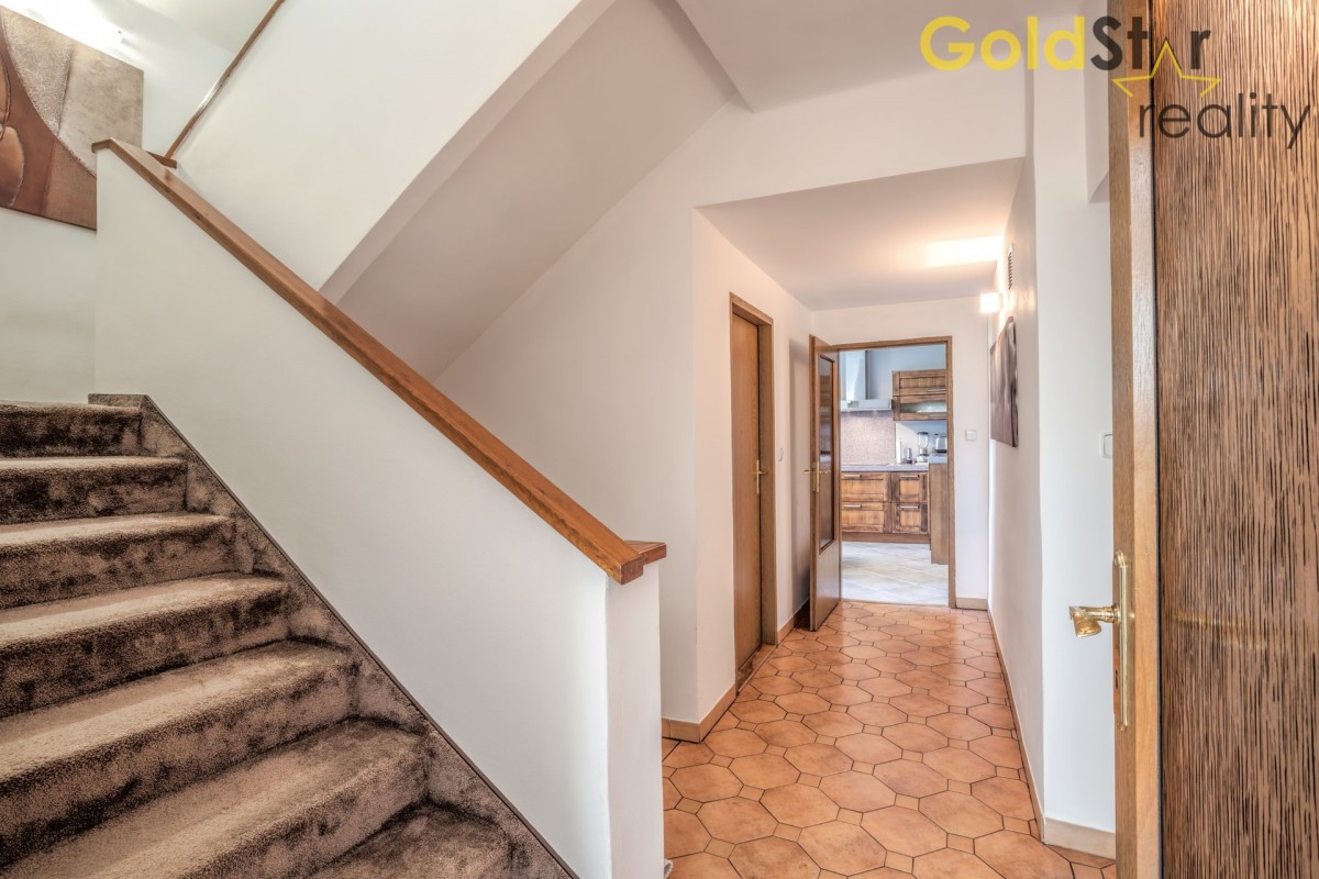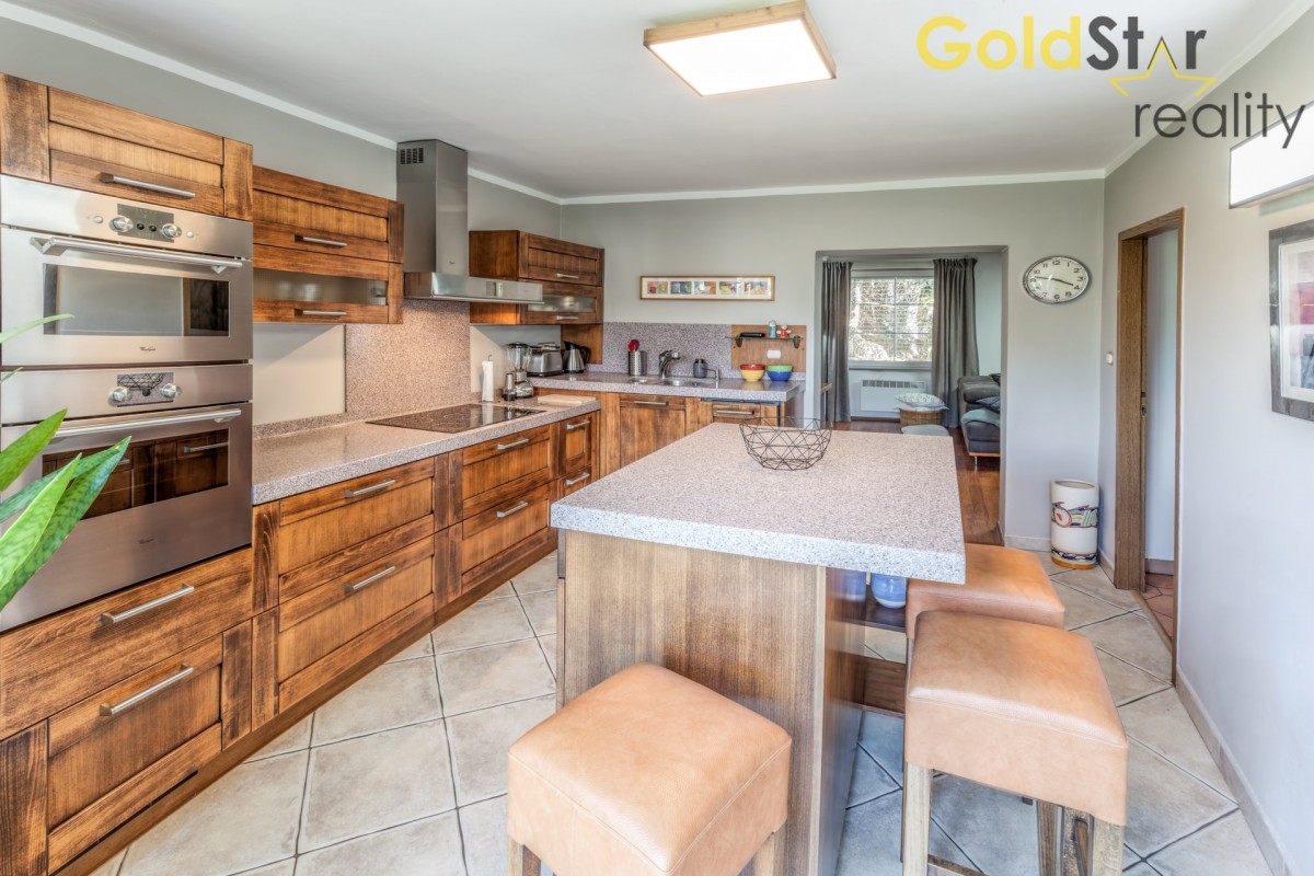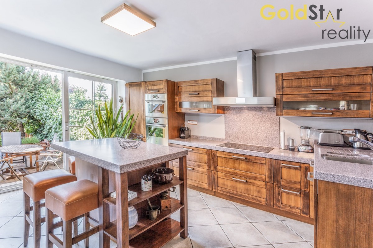 Ve zvýšeném přízemí hlavního domu se nachází předsíň s vestavěnou skříní, dále kuchyně (14, 5 m2), kde je zakázková kuchyňská linka s vestavnými spotřebiči Whirlpool, myčka Miele a jídelním ostrůvkem. Kuchyně plynule navazuje na prostorný obývací pokoj s krbem (33 m2). S předsíně je vstup do koupelny s rohovou vanou a toaletou. Z kuchyně je přímý vstup francouzským oknem na terasu (20m2), orientovanou do klidného vnitrobloku.