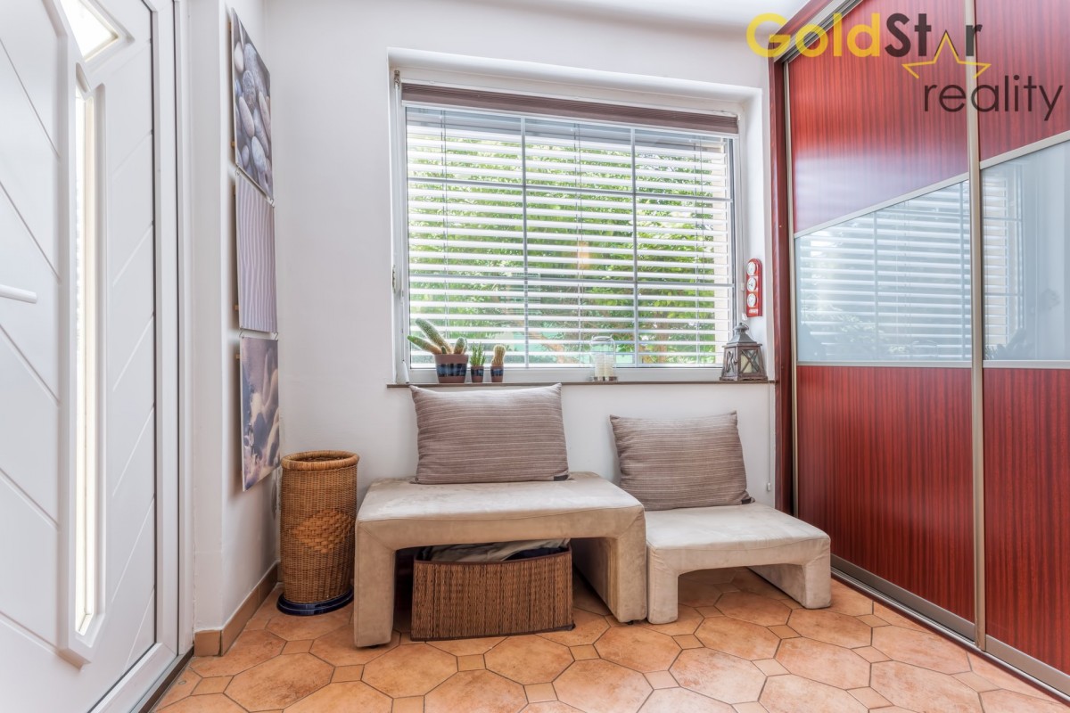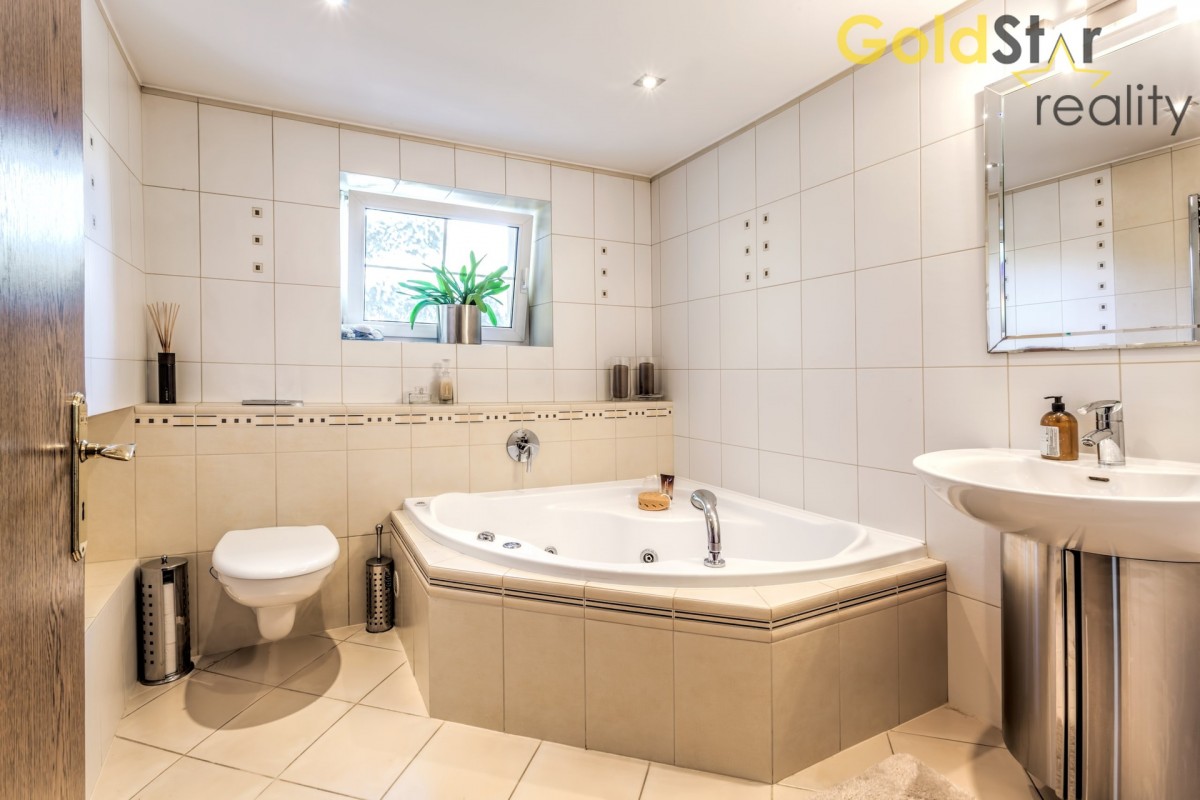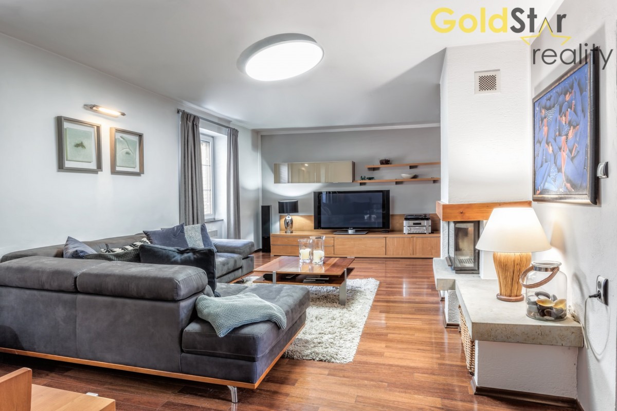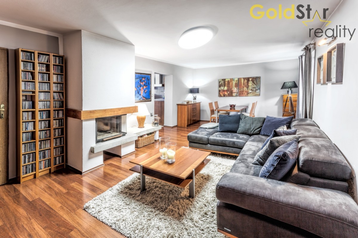 Ve zvýšeném přízemí hlavního domu se nachází předsíň s vestavěnou skříní, dále kuchyně (14, 5 m2), kde je zakázková kuchyňská linka s vestavnými spotřebiči Whirlpool, myčka Miele a jídelním ostrůvkem. Kuchyně plynule navazuje na prostorný obývací pokoj s krbem (33 m2). S předsíně je vstup do koupelny s rohovou vanou a toaletou. Z kuchyně je přímý vstup francouzským oknem na terasu (20m2), orientovanou do klidného vnitrobloku.