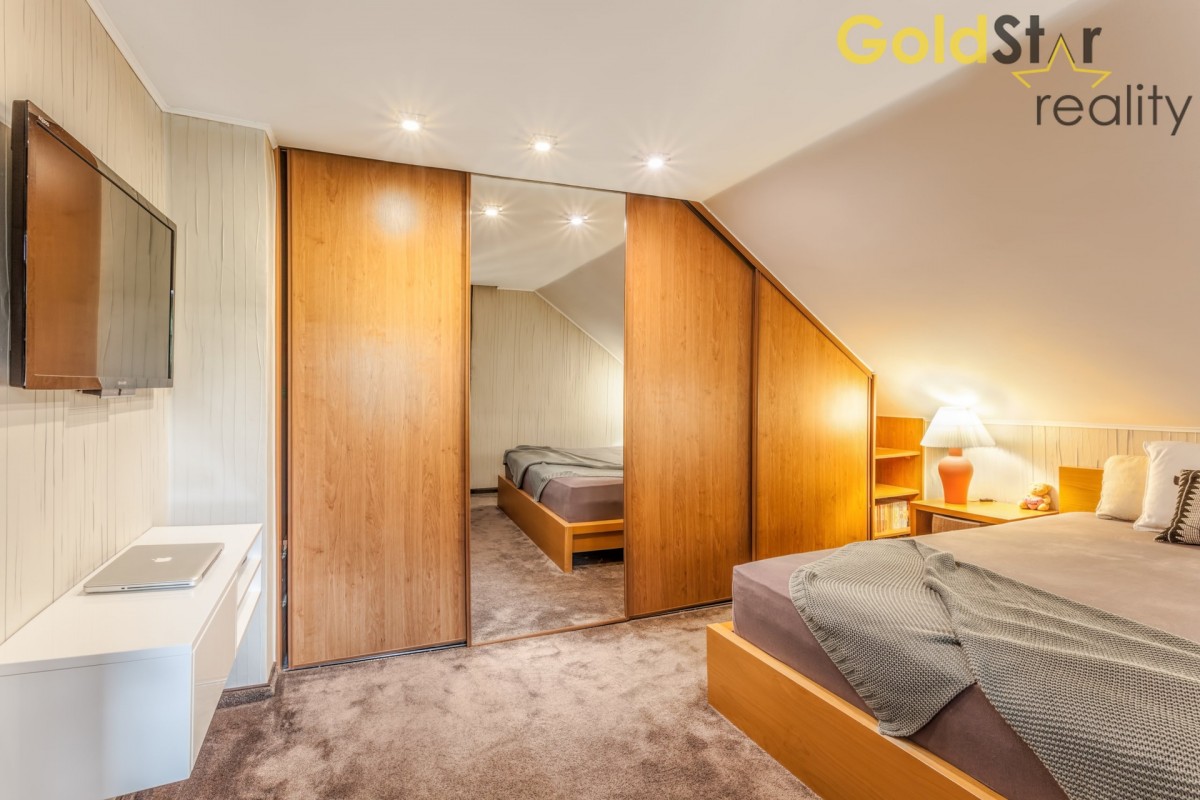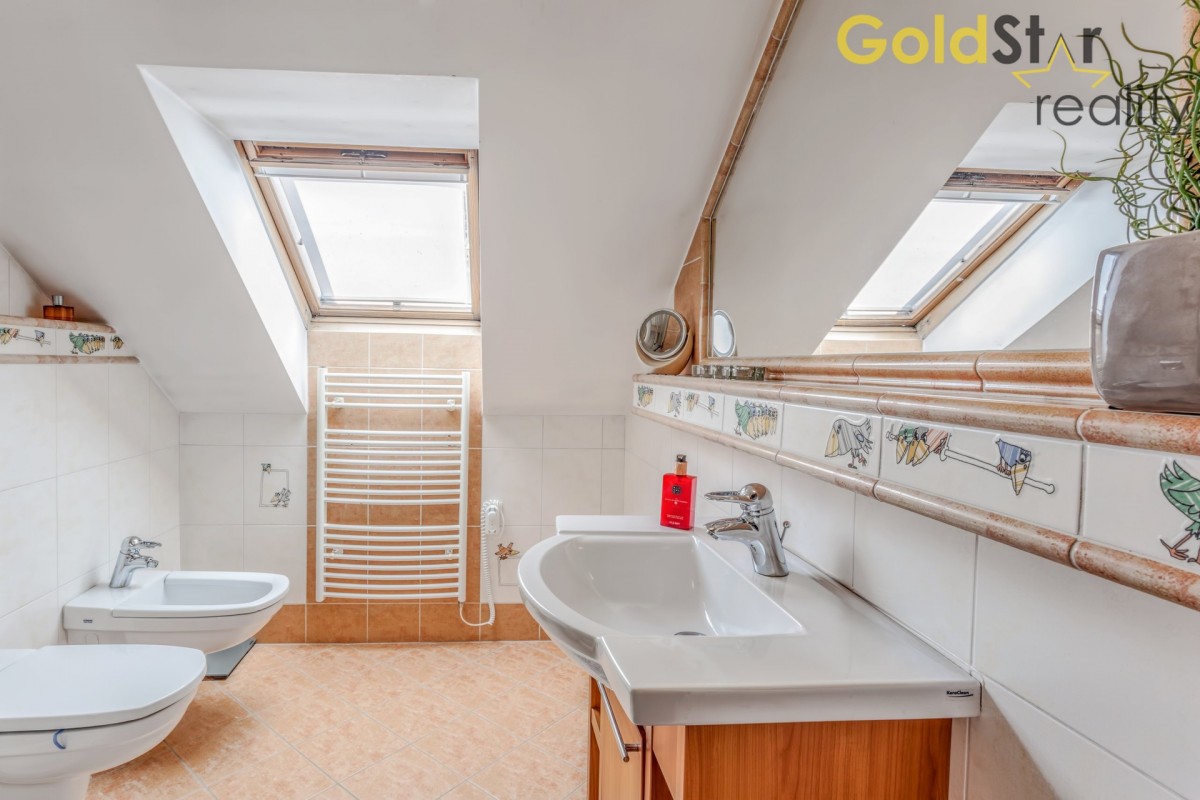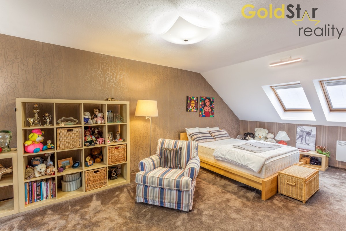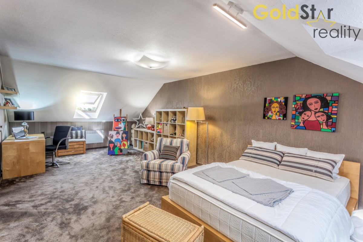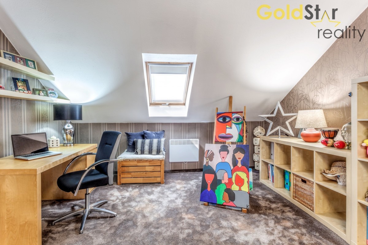 Na patře najdete ložnici (12 m2), velký podkrovní pokoj (31 m2), který je možno rozdělit na dva menší pokoje, pracovnu otevřenou do prostoru schodiště (7 m2), balkon a koupelnu se sprchovým koutem, toaletou a bidetem. Dům má menší sklep s technickým zázemím pro pračku a sušičku, přístupný z verandy, odkud se vychází také na zahradu.