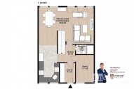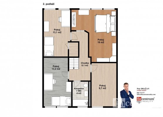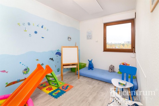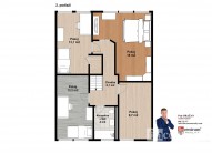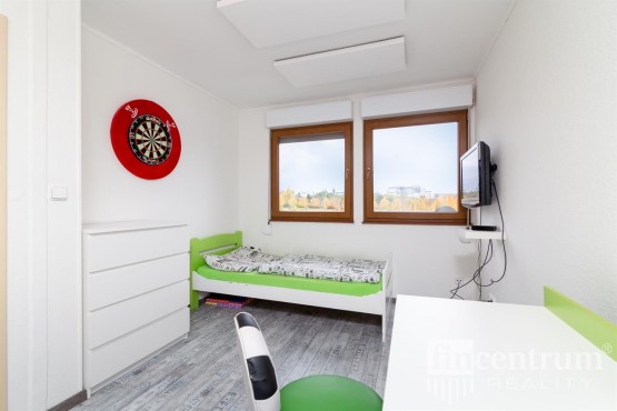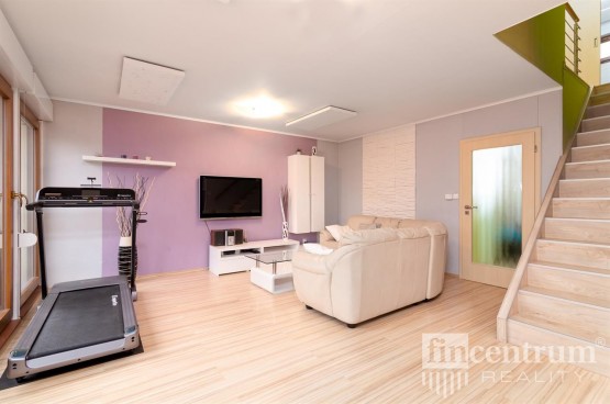 První nadzemní patro obsahuje obývací pokoj s přímým vstupem na terasu a na zahradu, kuchyňský kout, vybavený plně funkční kuchyňskou linkou, koupelnu s toaletou a pracovnu. V druhém nadzemním patře najdete ložnici, tři neprůchozí pokoje a druhou koupelnu s toaletou. Dům je zateplen. Může nabídnout půdní prostor vhodný k bydlení a podzemní podlaží, kde je technická místnost, dvě skladovací místnosti, toaleta a prostorná garáž.