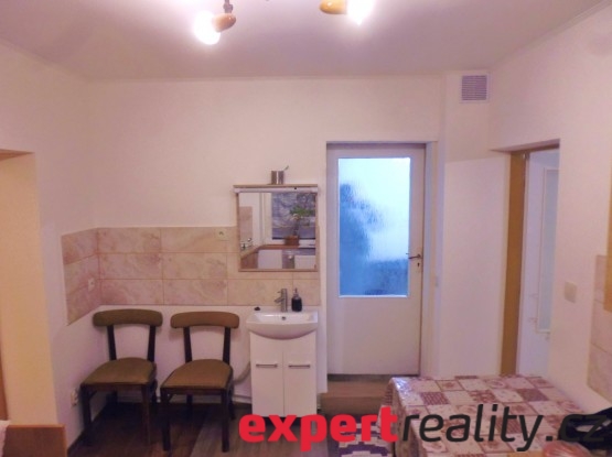 Dispozice: vstupními dveřmi vejdeme do prostorné předsíně, ze které rovně vedou dveře do skladovacího prostoru, vpravo vstupujeme do spojovací chodby, ze které jsou vpravo jednotlivé vstupy do sprchového koutu, samostatné toalety a kuchyně. Z kuchyně je vlevo první pokoj a vpravo druhý pokoj. Dál z chodby rovně postoupíme do prostoru za obytnou částí domu (původně menší dvůr).