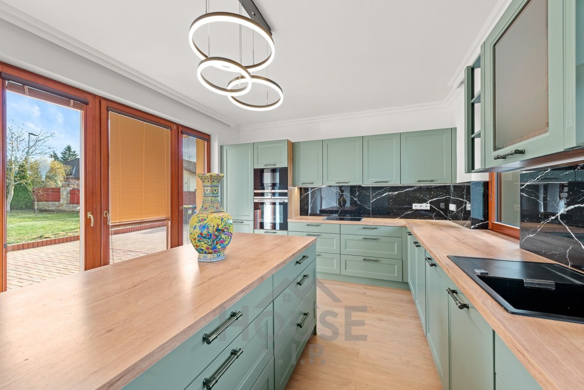 Součástí domu je zcela nová luxusní kuchyň na míru, vybavená spotřebiči značky Siemens, která potěší i náročné uživatele. Velká lednice, velký mrazák se sedmi přihrádkami, lednice na nápoje a spousta úložného prostoru.