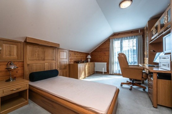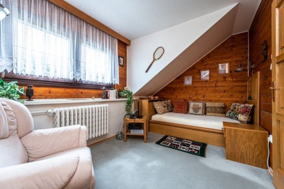 V mezipatře je ze schodiště přístupný ještě jeden větší pokoj s nižším stropem, sloužící pro spaní hostů nebo dětí.