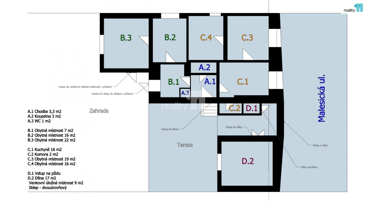 Součástí domu jsou dva dvouúrovňové sklepy, místnost na zahradní nářadí a dílna. Nad obytnou částí se nachází podkroví s možností vestavby dalších místností, což umožňuje rozšíření obytné plochy.