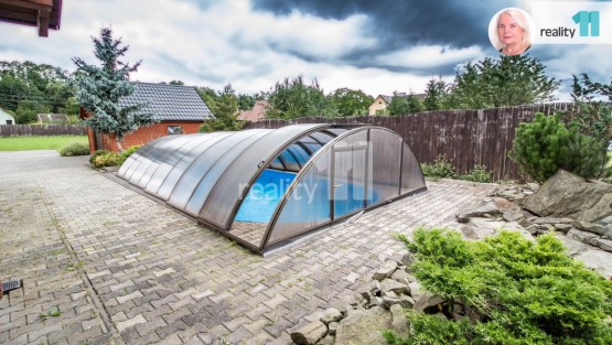 Dále se na pozemku nachází nákladně nově zrekonstruovaný bazén: zastřešení, osvětlení, filtrace a výkonný ohřev vody.