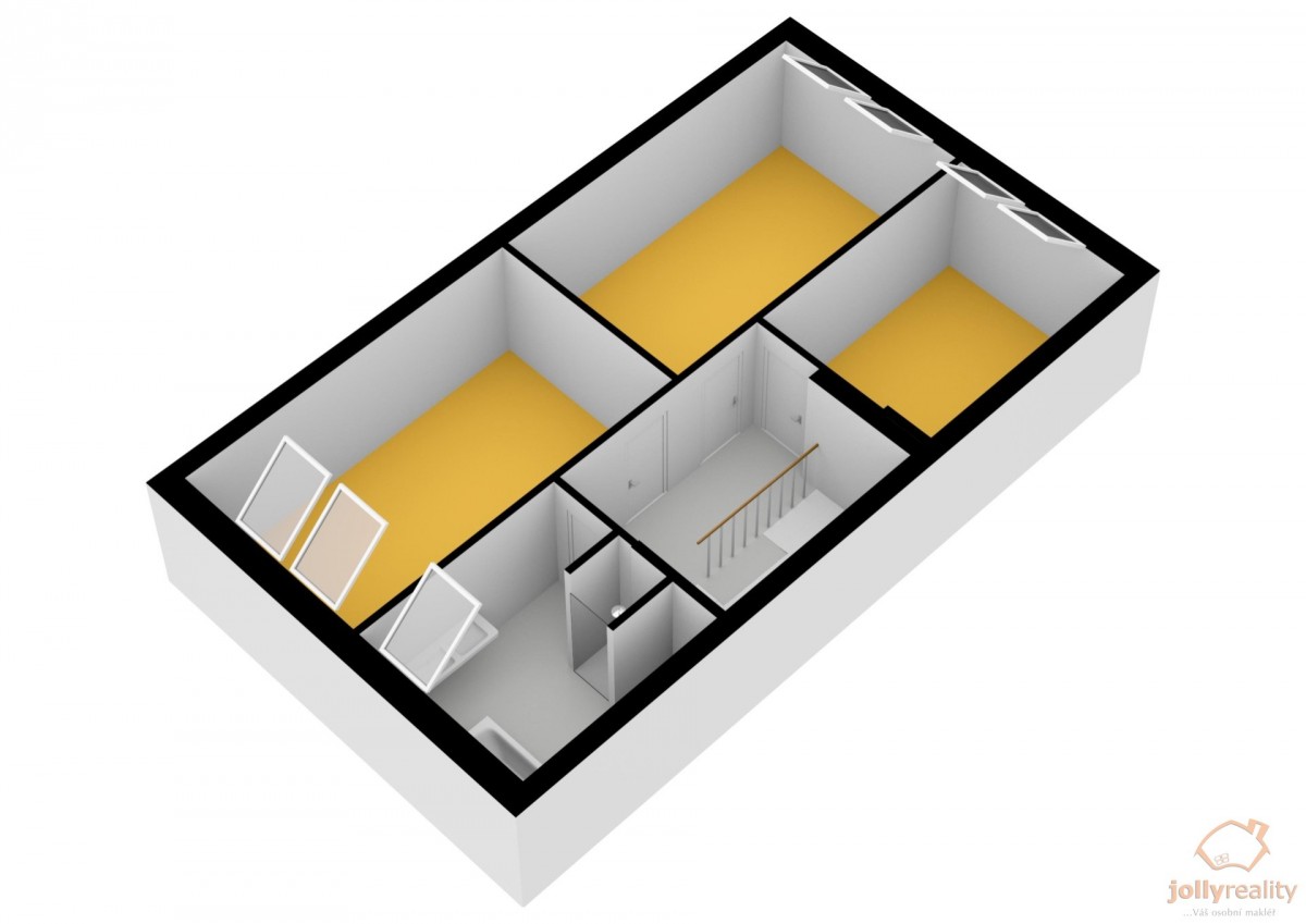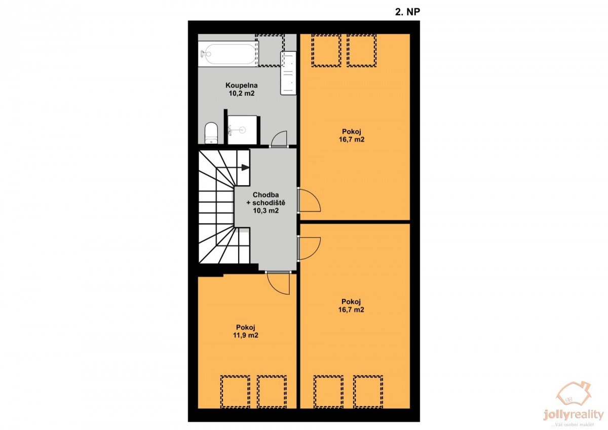 Z pokoje se po schodišti vchází do 2. NP (druhé nadzemní patro), kde jsou tři pokoje a koupelna vybavena vanou, sprchovým koutem, umyvadly s odkládací deskou je zde i sociální zařízení WC. Z chodby je vstup do půdního prostoru.