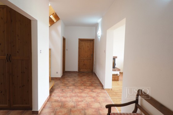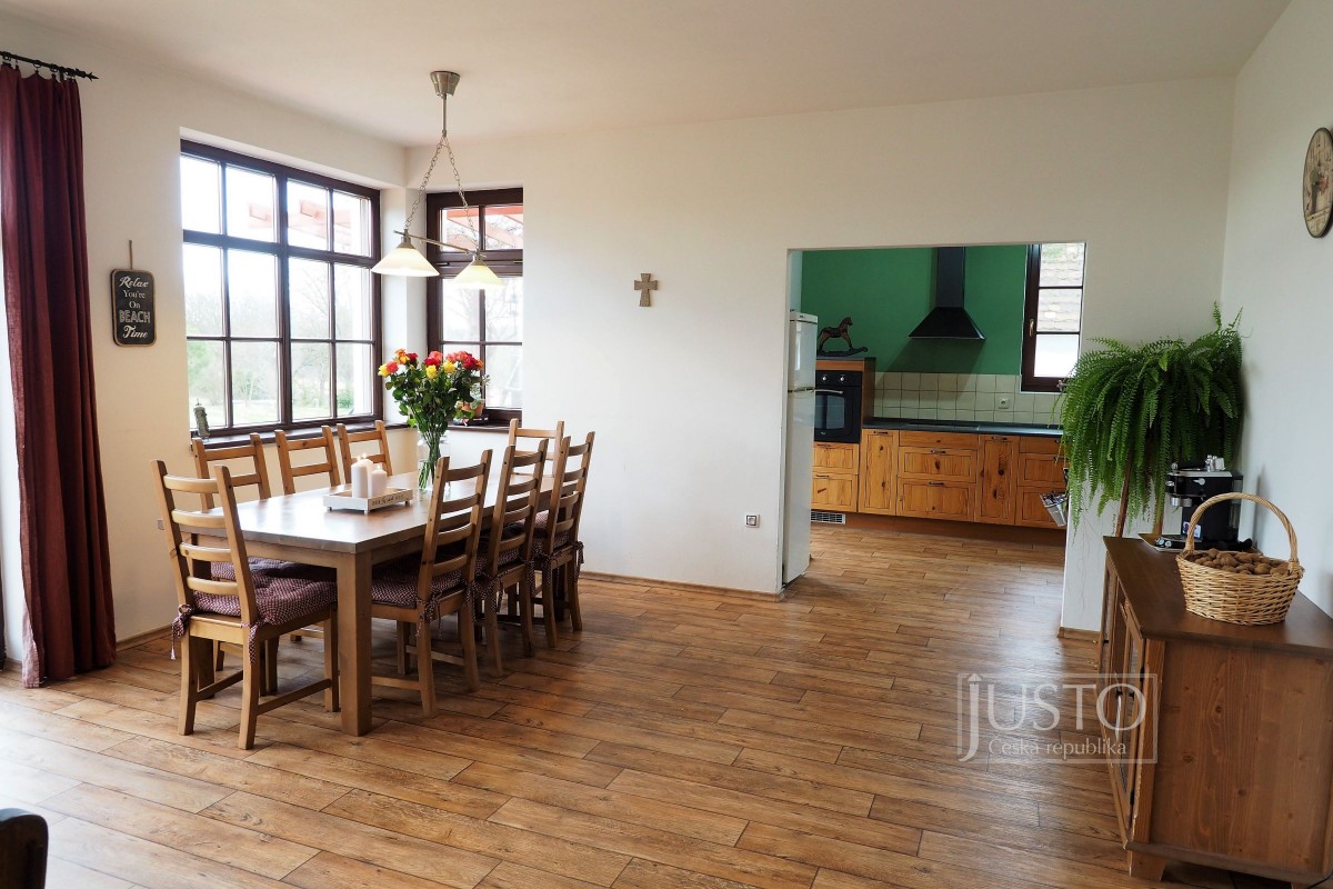 Nabízíme k prodeji samostatně stojící rodinný dům v obci Topělec (5km od Písku), který byl postaven v roce 2010 a to tak, aby byl nízkoenergetický, s bezbariérovým přízemím a s jednoduchým a praktickým dispozičním řešením ...7+1. Prostornou vstupní halou s dostatkem úložného prostoru je zajištěn vstup do centrální části domu, kterou tvoří velkorysý obývací pokoj s jídelnou, který je volně průchozí do kuchyně. Jak z kuchyně, tak i obývacího pokoje je vstup na terasu a zahradu. Obývací pokoj je vybaven krbovými kamny. Kuchyně je zařízena rustikální kuchyňskou linkou z masivu. V přízemí se dále nachází dvě ložnice, z níž jedna je v současné době využívána jako skladová místnost. Bezbariérová koupelna je s vanou a sociální zařízení WC zvlášť. Pohodlným schodištěm je zajištěn přístup do obytného podkroví, kde je pět samostatných pokojů, koupelna se sprchovým koutem, sociální zařízení WC zvlášť, úložná místnost a vstup na půdu. Podkrovní místnosti jsou prostorné. K domu patří stodola o výměře 135 m², ve které je dostatek místa pro parkování, skladování nebo dílnu. Veškeré interiérové dveře jsou dřevěné. Vytápění je zajištěno plynovým kotlem, v obývacím pokoji, kuchyni, v jedné z přízemních ložnic a v koupelně je podlahové vytápění, dům pohodlně vytopí i krbová kamna v obývacím pokoji. Voda je obecní i z vlastní studny. Vlastní ČOV (osobní vlastnictví). Dům je umístěn na pozemku tak, že je na zahradě zajištěno soukromí a klid. Zahrada je osázena ovocnými a okrasnými stromy, v části přilehlé k domu je umístěn nadzemní bazén. PENB je v přípravě.