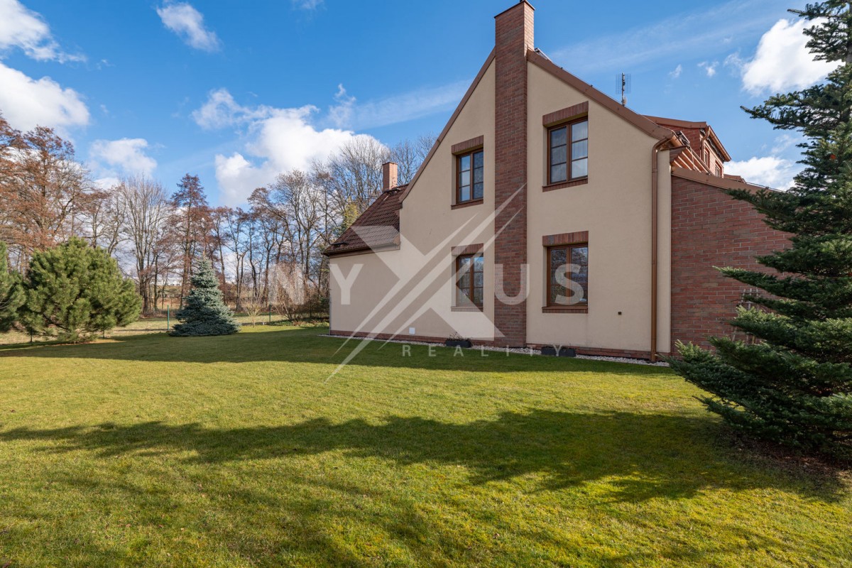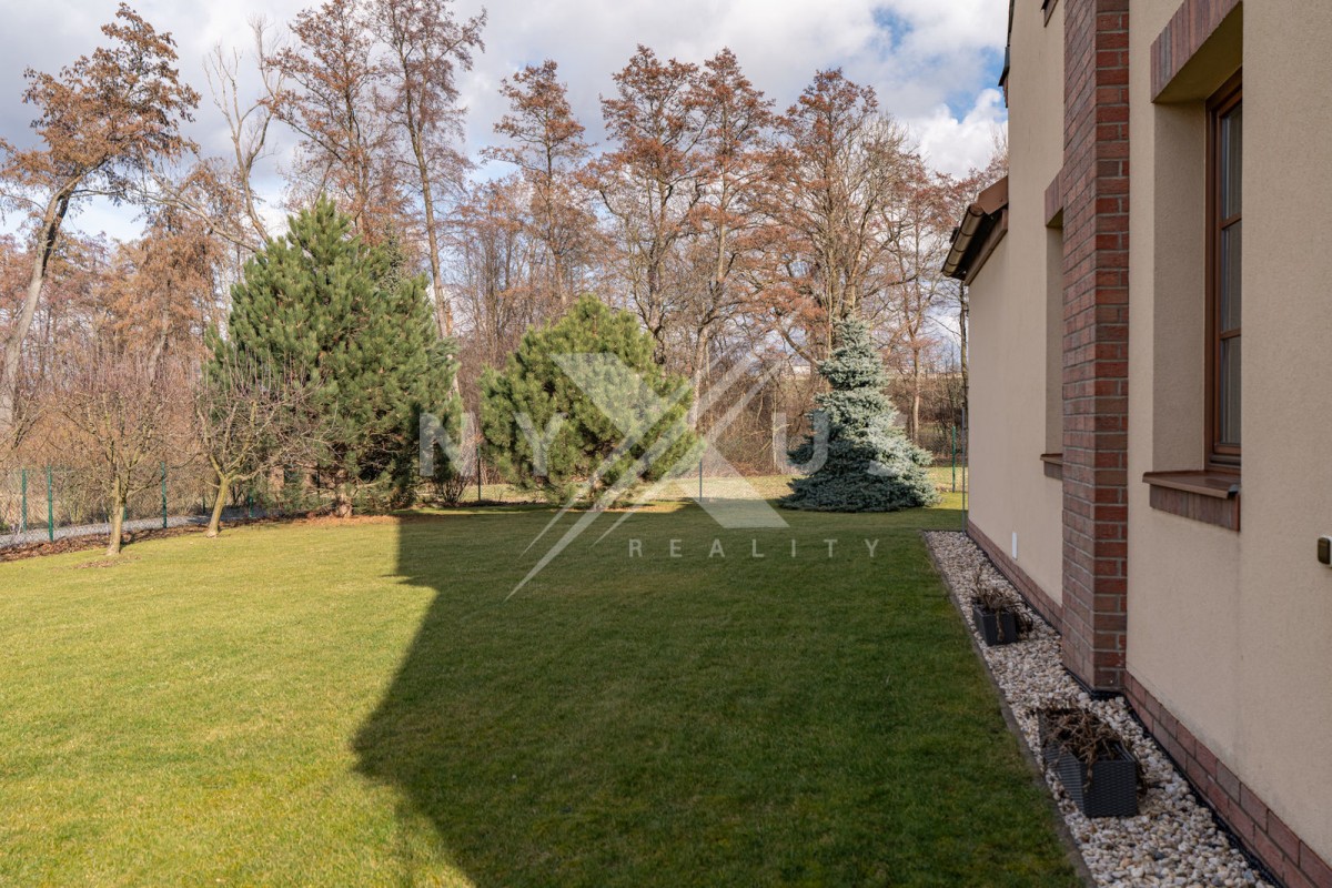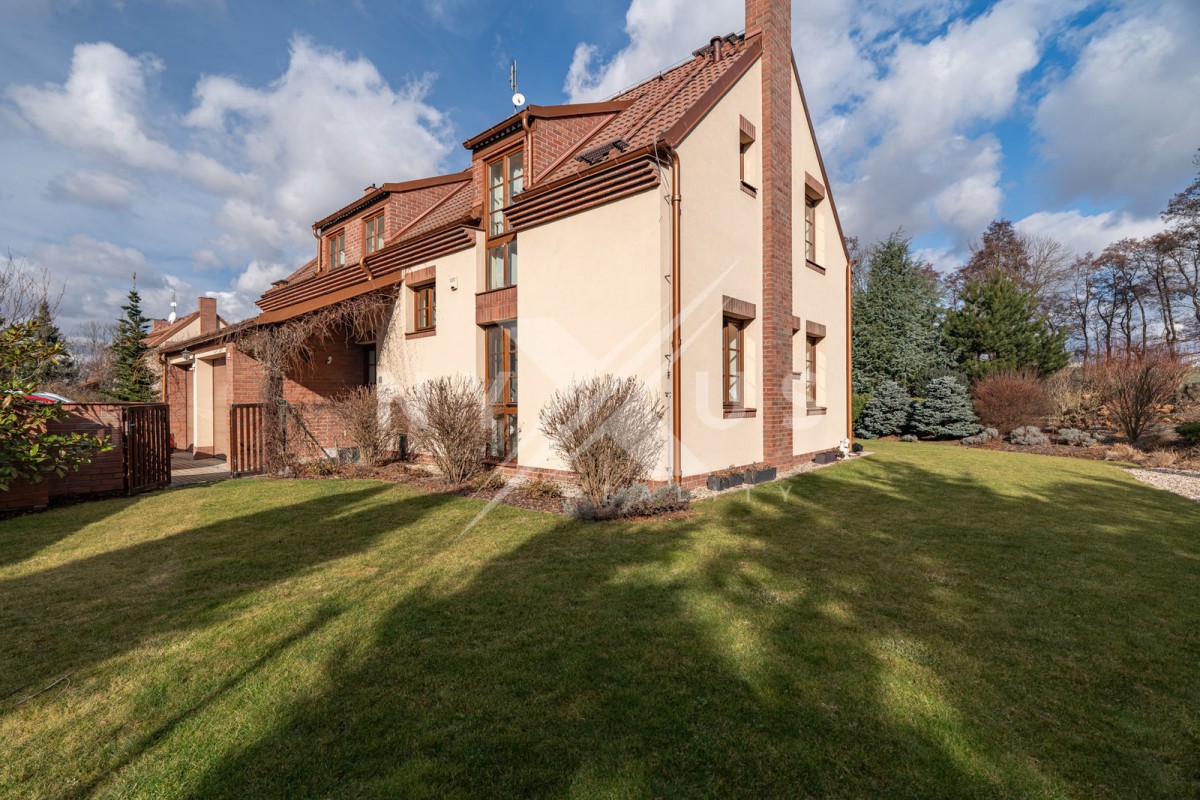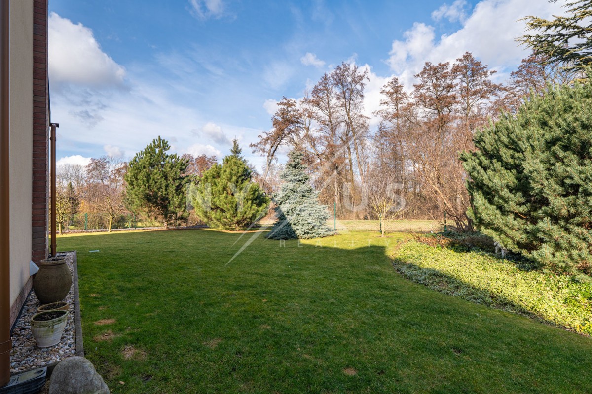 Elegantní dvoupodlažní dům v anglickém stylu stojí uprostřed rovné zahrady se vzrostlými stromy a keři, nechybí ani různé druhy těch ovocných. Pěstěný trávník udržuje automatická závlaha, zahradní technika je uskladněna v samostatném zahradním domku. Velký pozemek nabízí mnoho dalších využití, jako je například vybudování zimní zahrady, sauny, bazénu či rozšíření domu.