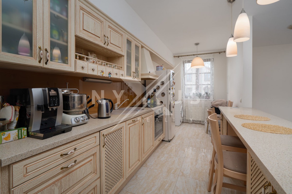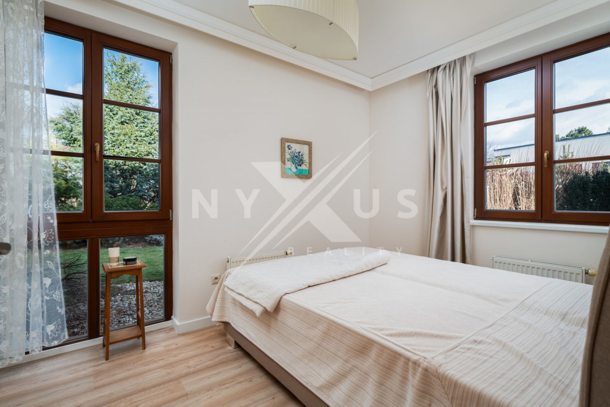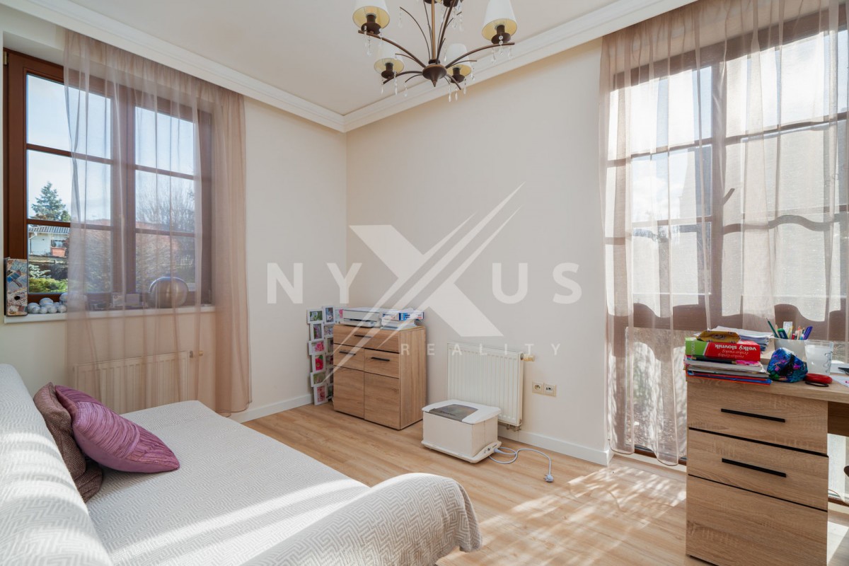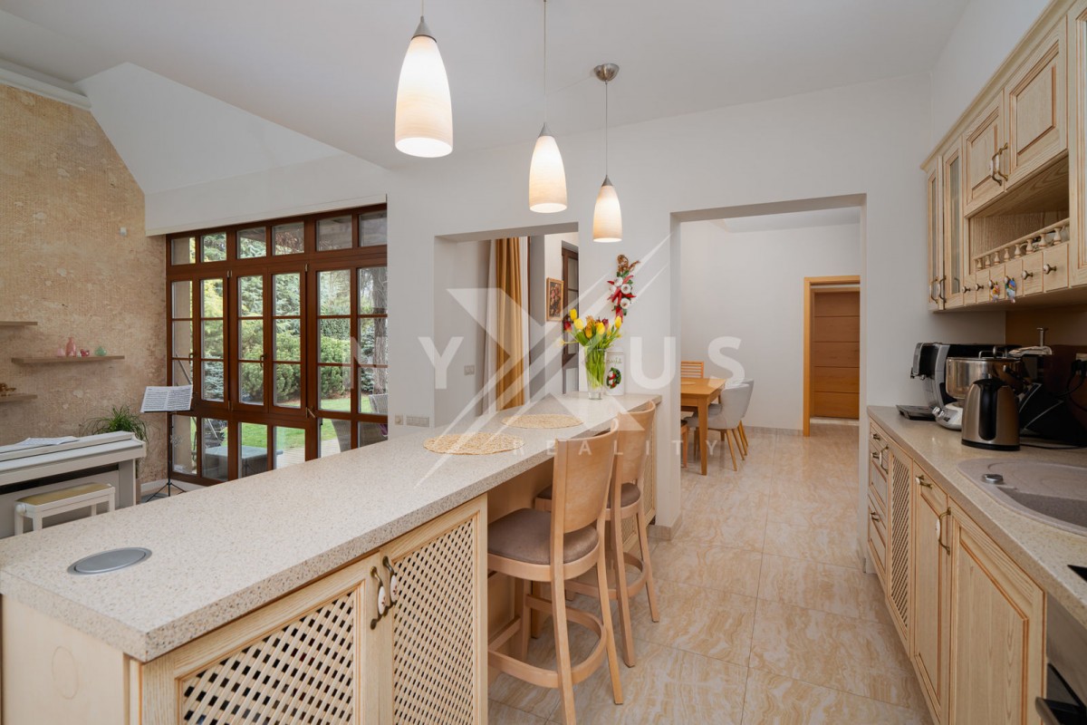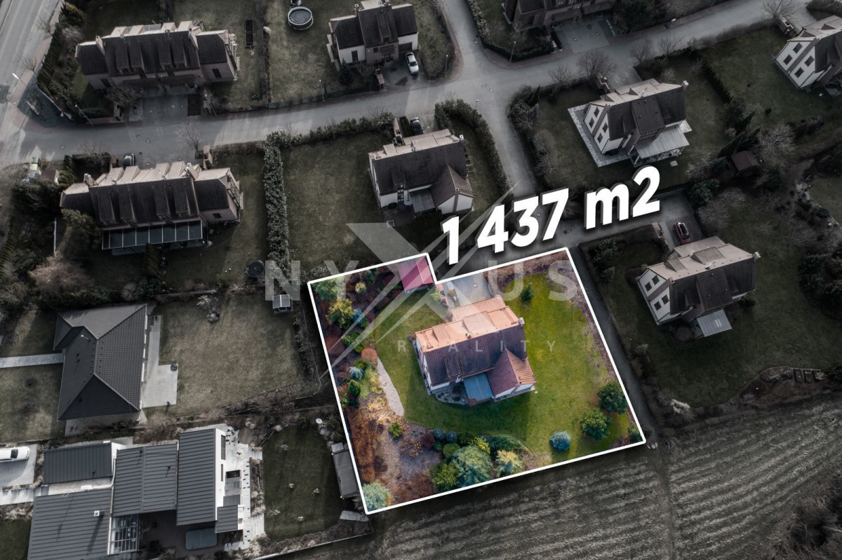 Elegantní dvoupodlažní dům v anglickém stylu stojí uprostřed rovné zahrady se vzrostlými stromy a keři, nechybí ani různé druhy těch ovocných. Pěstěný trávník udržuje automatická závlaha, zahradní technika je uskladněna v samostatném zahradním domku. Velký pozemek nabízí mnoho dalších využití, jako je například vybudování zimní zahrady, sauny, bazénu či rozšíření domu.